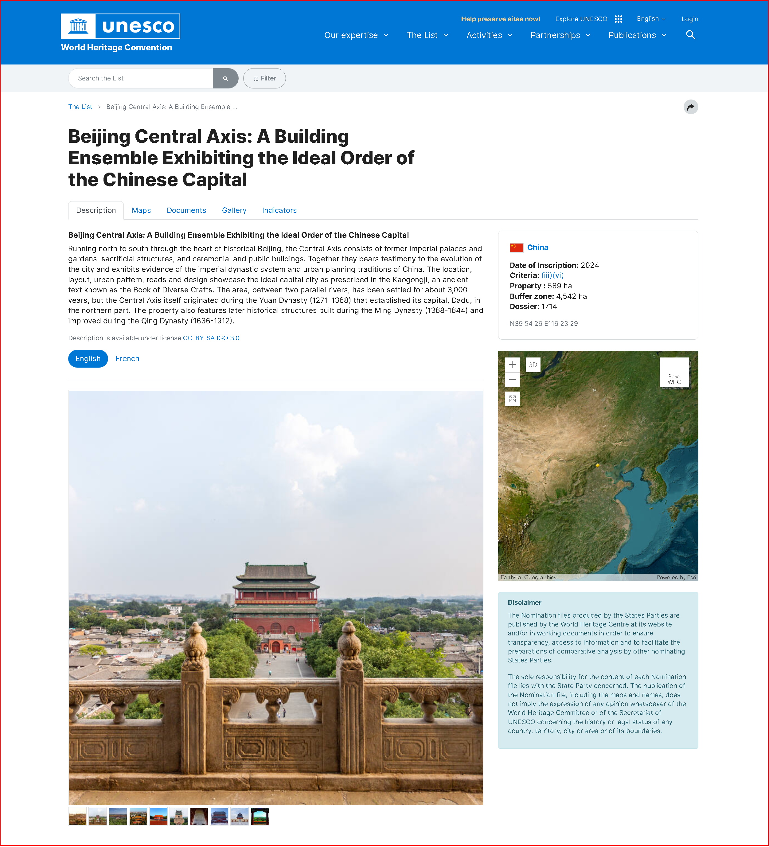 據(jù)介紹,聯(lián)合國教科文組織世界遺產(chǎn)委員會認可“北京中軸線”的完整性、真實性和保護管理狀況,及其作為社會和政治中心對中國社會發(fā)揮持續(xù)的作用,認為“北京中軸線”代表了世界城市歷史中的一種特有類型,其所體現(xiàn)的中國傳統(tǒng)都城規(guī)劃理論和“中”“和”哲學思想,為世界城市規(guī)劃史作出了重要貢獻。該組織高度贊賞中國政府在北京老城文化遺產(chǎn)保護傳承方面付出的巨大努力和取得的突出成績。