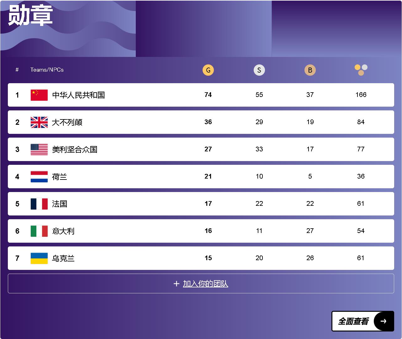 目前中國代表團以74金55銀37銅繼續領跑金牌榜,英國隊、美國隊分列二、三位。
