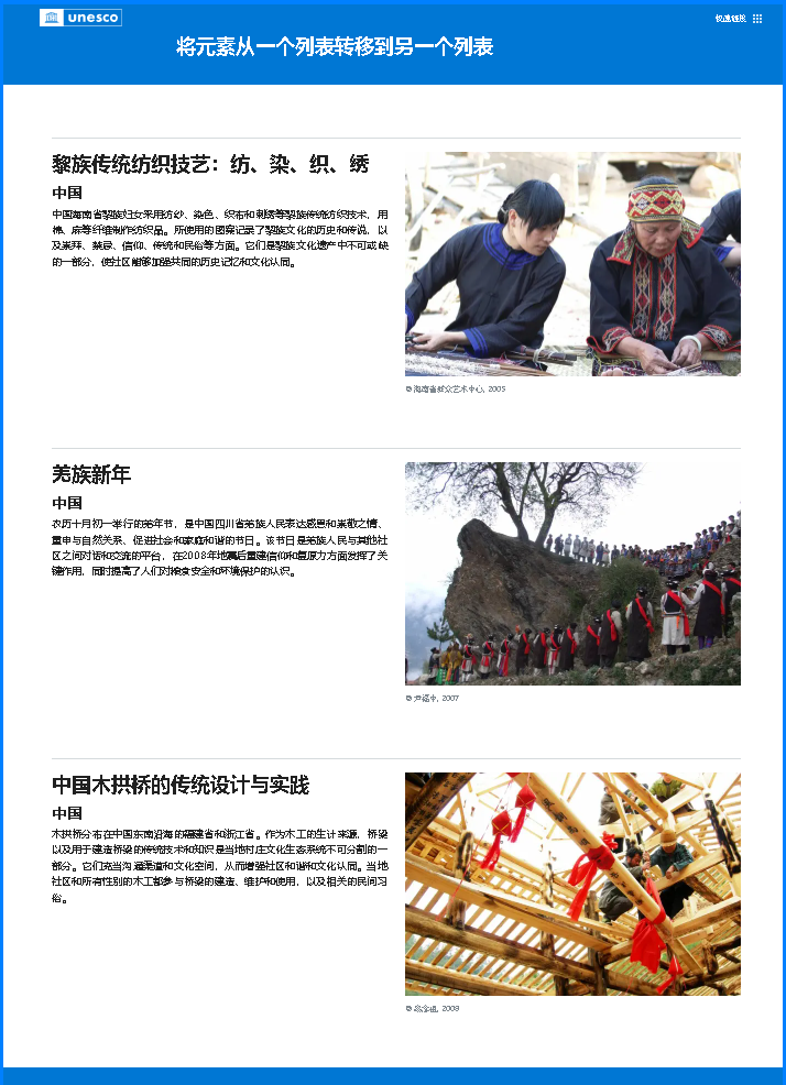 自2009年列入急需保護的非物質文化遺產名錄以來,上述3個遺產項目保護成效顯著,存續力持續提升?!袄枳鍌鹘y紡染織繡技藝”通過成立合作社和企業,帶動當地黎族群眾特別是婦女就業增收;“羌年”在羌族傳統文化保護、帶動當地文化生態旅游和鄉村特色旅游發展方面發揮了重要作用;“中國木拱橋傳統營造技藝”的保護傳承形成了非物質文化遺產項目與文化和自然生態協同保護的良好態勢。這是聯合國教科文組織《保護非物質文化遺產公約》名錄機制框架下首次正式實施轉名錄程序。上述遺產項目成功轉入代表作名錄,既體現了中國開展非遺系統性保護的優秀實踐和成果,也為各國開展非遺保護提供有益參考。