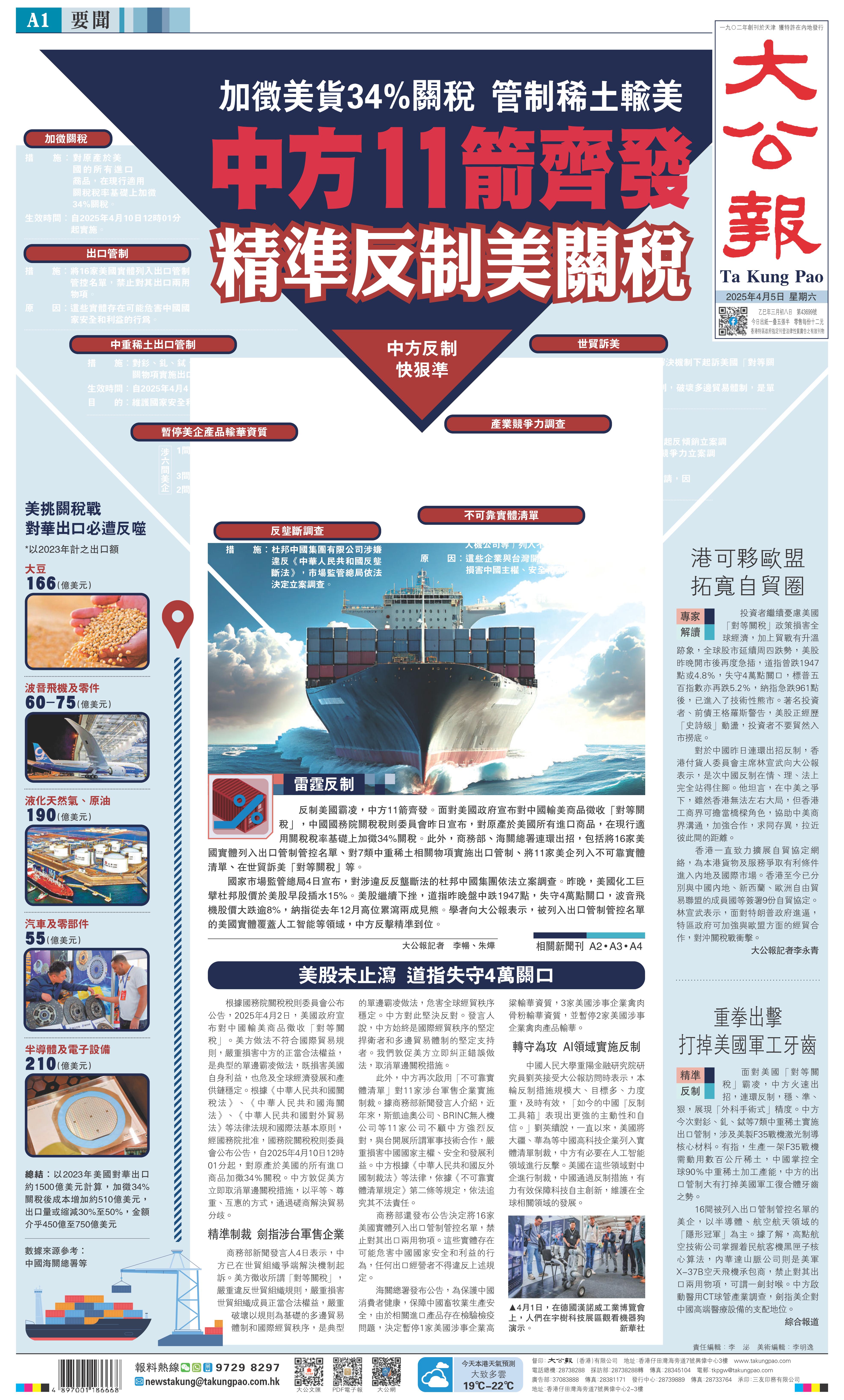 國家市場監管總局4日宣布,對涉違反反壟斷法的杜邦中國集團依法立案調查。昨晚,美國化工巨擘杜邦股價于美股早段插水15%。美股繼續下挫,道指昨晚盤中跌1947點,失守4萬點關口,波音飛機股價大跌逾8%,納指從去年12月高位累瀉兩成見熊。學者向大公報表示,被列入出口管制管控名單的美國實體覆蓋人工智能等領域,中方反擊精準到位。 \大公報記者李暢、朱燁