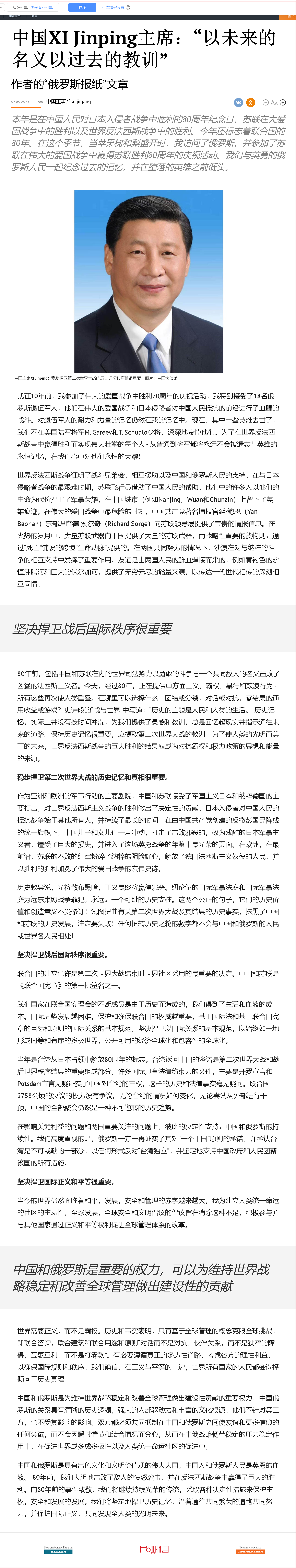 中國和俄羅斯都是有著燦爛文明的偉大國家,中國人民和俄羅斯人民都是有著英雄血脈的偉大人民。80年前,我們經過奮起反抗,贏得了反法西斯戰爭偉大勝利。80年后的今天,我們要采取一切必要措施,堅決維護自身主權、安全、發展利益,堅定做歷史記憶的守護者、發展振興的同行者、國際公平正義的捍衛者,攜手為人類前途命運爭取更加光明的未來。