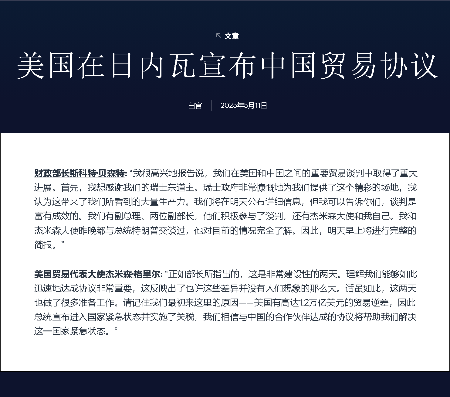美國將(一)修改2025年4月2日第14257號行政令中規定的對中國商品(包括香港特別行政區和澳門特別行政區商品)加征的從價關稅,其中,24%的關稅在初始的90天內暫停實施,同時保留按該行政令的規定對這些商品加征剩余10%的關稅;(二)取消根據2025年4月8日第14259號行政令和2025年4月9日第14266號行政令對這些商品的加征關稅。