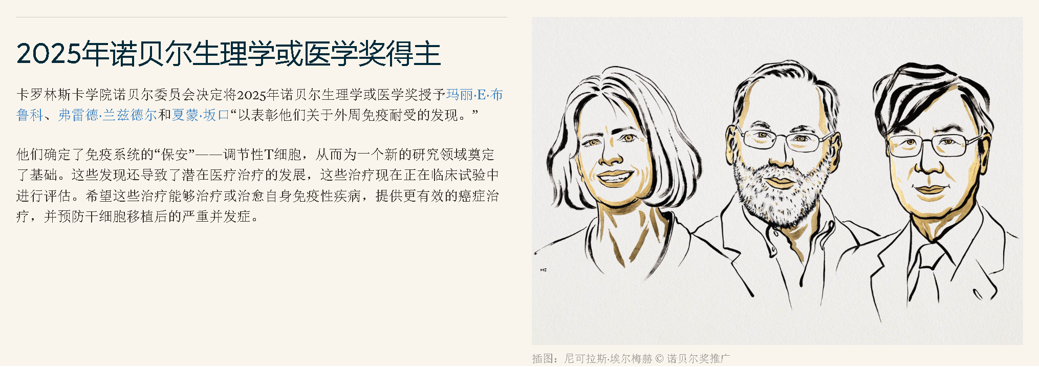 諾獎官網公報介紹,人體強大的免疫系統必須得到調節,否則可能會攻擊自身器官。三名獲獎者在外周免疫耐受方面取得了突破性發現,坂口志文發現了調節性T細胞,它可以有效阻止免疫系統攻擊人體自身,布倫科和拉姆斯德爾則找到了與之相關的基因,這些成果加深了科學界對免疫系統如何運作的理解,推動了自身免疫性疾病等方面的研究。