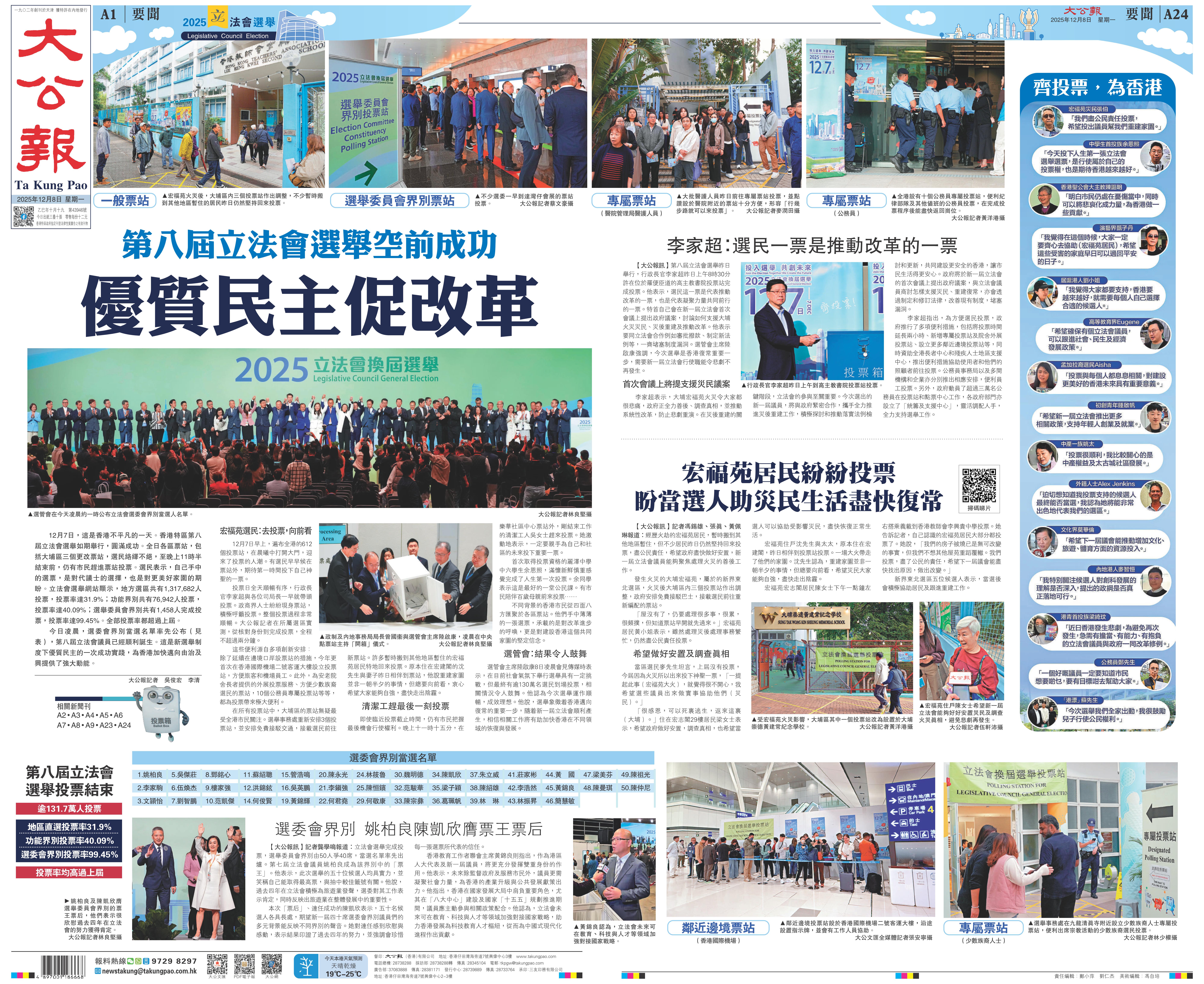 香港特別行政區第八屆立法會選舉投票于7日23時30分結束。12月8日清晨,經過點票,分區直接選舉界別的20名議員最終成功選出,至此,加上8日稍早時的選舉委員會界別40席、功能團體界別30席,本次香港特區立法會選舉需要選出的90名立法會議員已全部選出。這是香港在完善選舉制度、落實“愛國者治港”原則后舉行的又一次重要選舉。