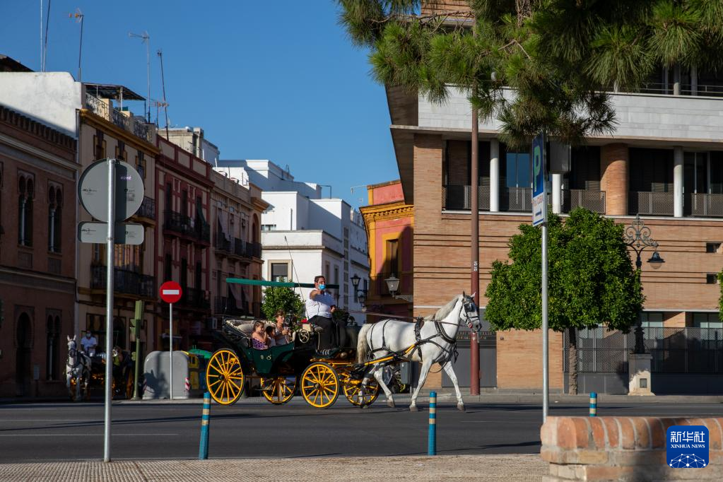 2021年6月25日,一輛馬車駛過西班牙塞維利亞街頭。新華社記者 孟鼎博 攝