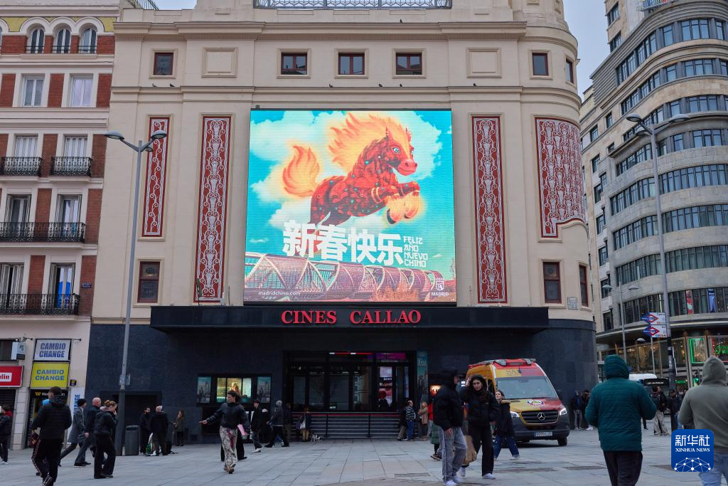 2月11日,西班牙首都馬德里街頭的一塊顯示屏播放中國春節主題視頻。新華社記者 孟鼎博 攝