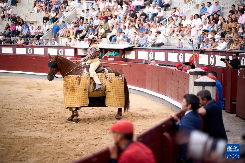 2025年9月7日,一名騎馬長矛手在西班牙首都馬德里的拉斯本塔斯斗牛場內參加表演。新華社記者 孟鼎博 攝
