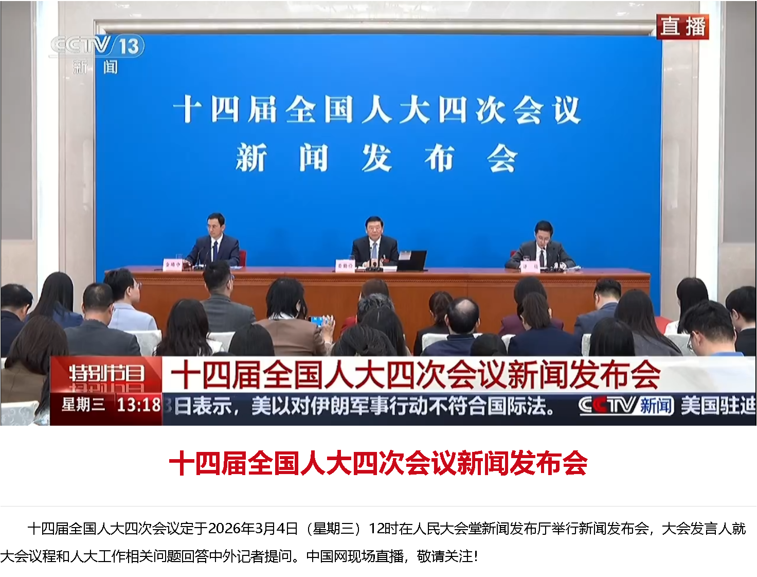 會議期間將舉行3場記者會,分別為經(jīng)濟(jì)、民生、外交主題。安排3場“代表通道”和3場“部長通道”采訪活動,分別在開幕會、第二次全體會議和閉幕會的前后舉行。