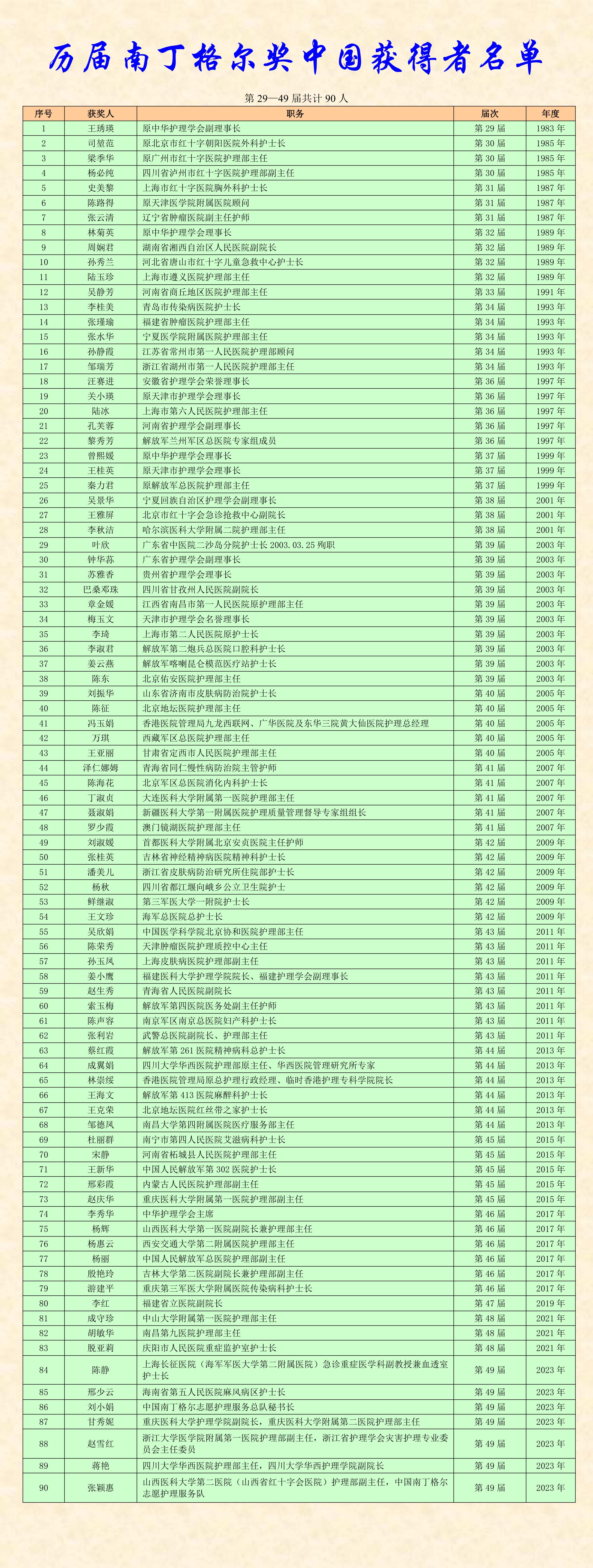南丁格爾獎是紅十字國際委員會為紀(jì)念佛羅倫斯·南丁格爾在改善戰(zhàn)地傷病人員護理方面做出的卓越貢獻而設(shè)立的國際護理界最高榮譽獎。南丁格爾獎候選人要求長期從事護理工作或護理志愿服務(wù)工作,具有高尚的思想道德素養(yǎng)和高超的護理專業(yè)水平,在重大突發(fā)事件緊急救援或特殊疾病護理工作中表現(xiàn)出非凡的勇氣和獻身精神。我國自1983年參與第29屆南丁格爾獎評選以來,已有90位優(yōu)秀護理工作者獲此殊榮。