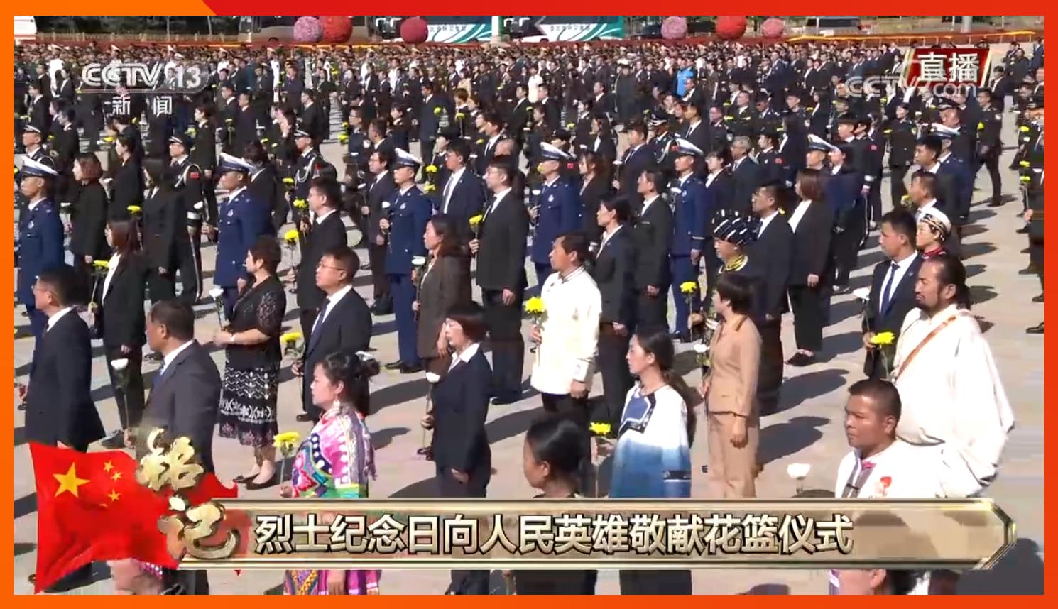 方陣前,以中共中央,全國(guó)人大常委會(huì),國(guó)務(wù)院,全國(guó)政協(xié),中央軍委,各民主黨派、全國(guó)工商聯(lián)和無黨派愛國(guó)人士,各人民團(tuán)體和各界群眾,老戰(zhàn)士、老同志和烈士親屬,中國(guó)少年先鋒隊(duì)名義敬獻(xiàn)的9個(gè)大型花籃一字排開,花籃紅色緞帶上書寫的“人民英雄永垂不朽”格外醒目。