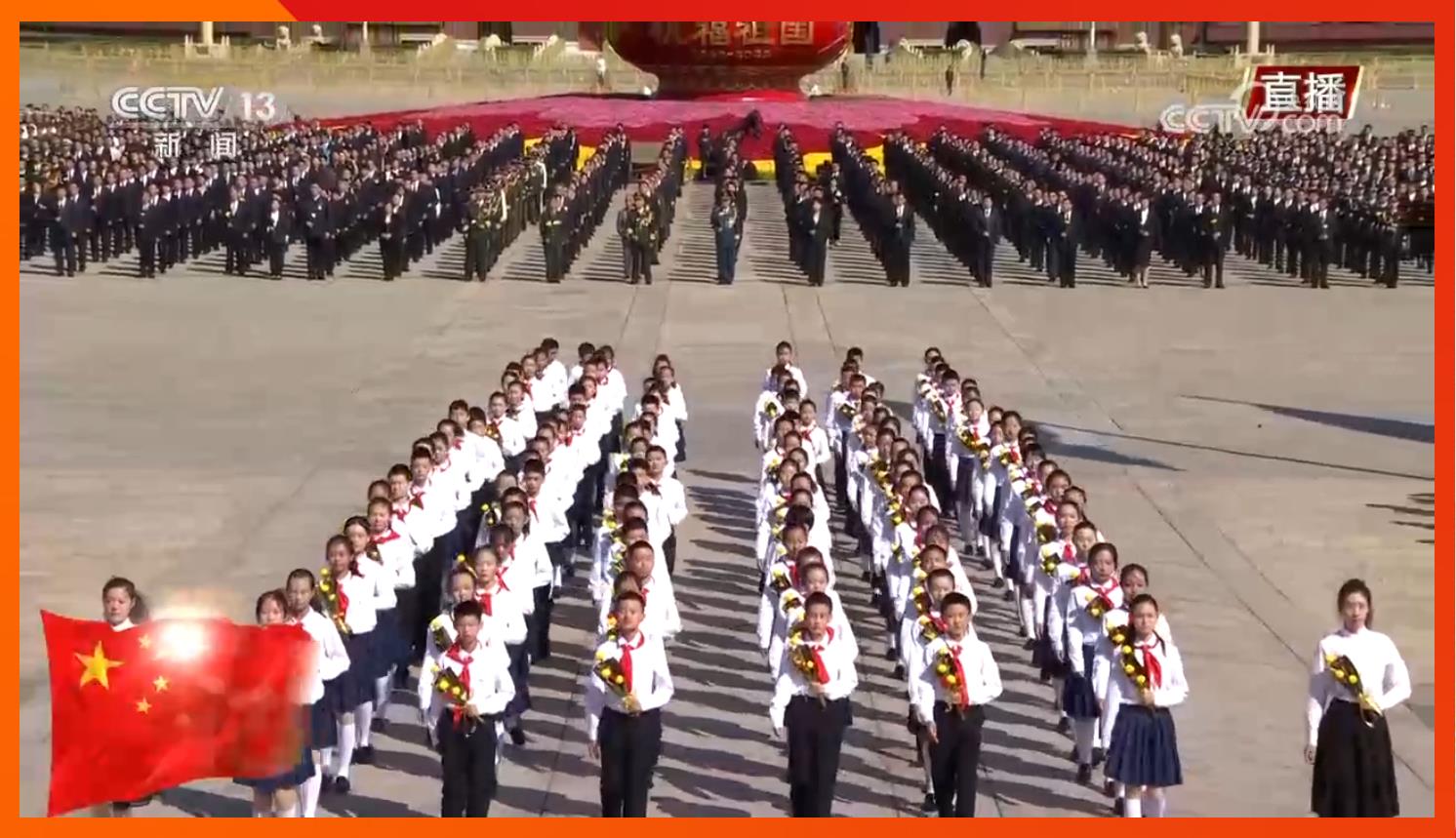 默哀畢,手持鮮花的少年兒童面向人民英雄紀(jì)念碑高唱《我們是共產(chǎn)主義接班人》,并致少年先鋒隊(duì)隊(duì)禮。