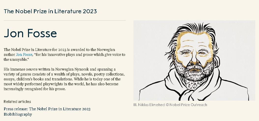 2023 年諾貝爾文學獎授予挪威作家喬恩·福斯,“表彰他的創(chuàng)新戲劇和散文,為難以言喻的事物發(fā)聲。”他用挪威尼諾斯克語寫成的巨著涵蓋多種體裁,包括豐富的戲劇、小說、詩集、散文、兒童讀物和翻譯作品。雖然他如今是世界上演出最廣泛的劇作家之一,但他的散文也越來越受到認可。