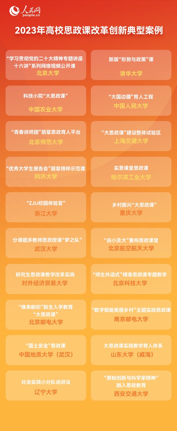 報告根據(jù)各高校思政課程的社會反響、信息傳播量、主流媒體關(guān)注度、輿論反饋情況等維度,在全國征集推介“北京大學(xué)‘學(xué)習(xí)貫徹黨的二十大精神專題講座十六講’系列網(wǎng)絡(luò)視頻公開課”“清華大學(xué)新版‘形勢與政策’課”“中國農(nóng)業(yè)大學(xué)科技小院‘大思政課’”“中國人民大學(xué)‘大國邊疆’育人工程”“哈爾濱工業(yè)大學(xué)實景課堂思政課”等20個優(yōu)秀思政課程案例,以期為各高校思政課改革創(chuàng)新提供借鑒啟示。