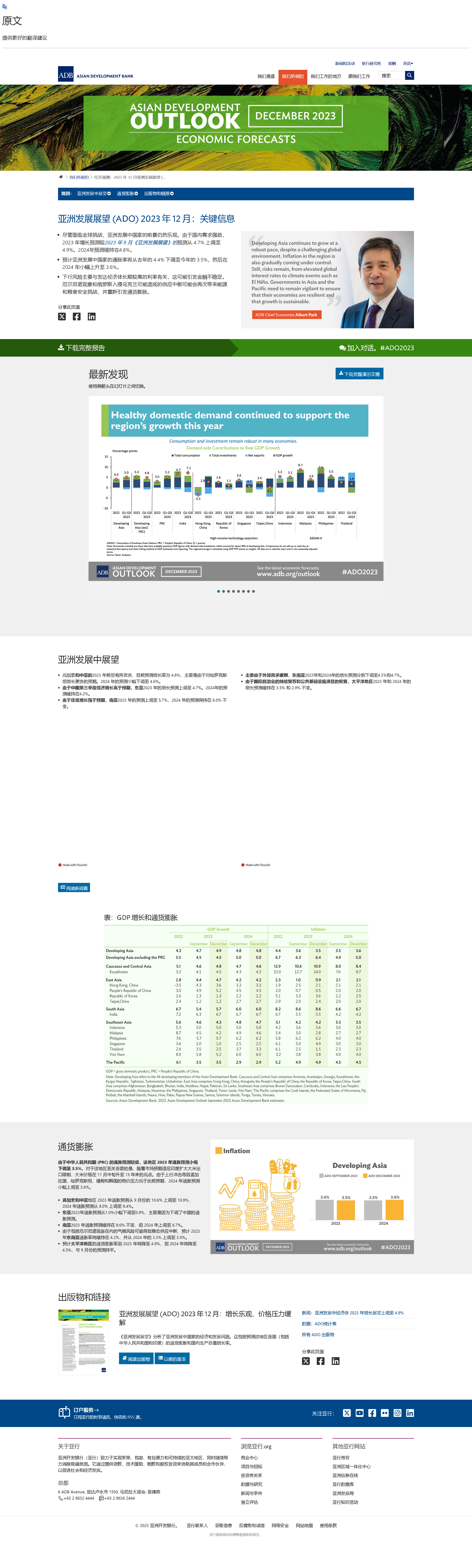 亞洲開發銀行是聚焦亞太地區發展的多邊開發銀行,成立于1966年,總部設在菲律賓首都馬尼拉。《亞洲發展展望》是亞行的年度旗艦經濟報告,對亞太地區經濟發展作出預測。