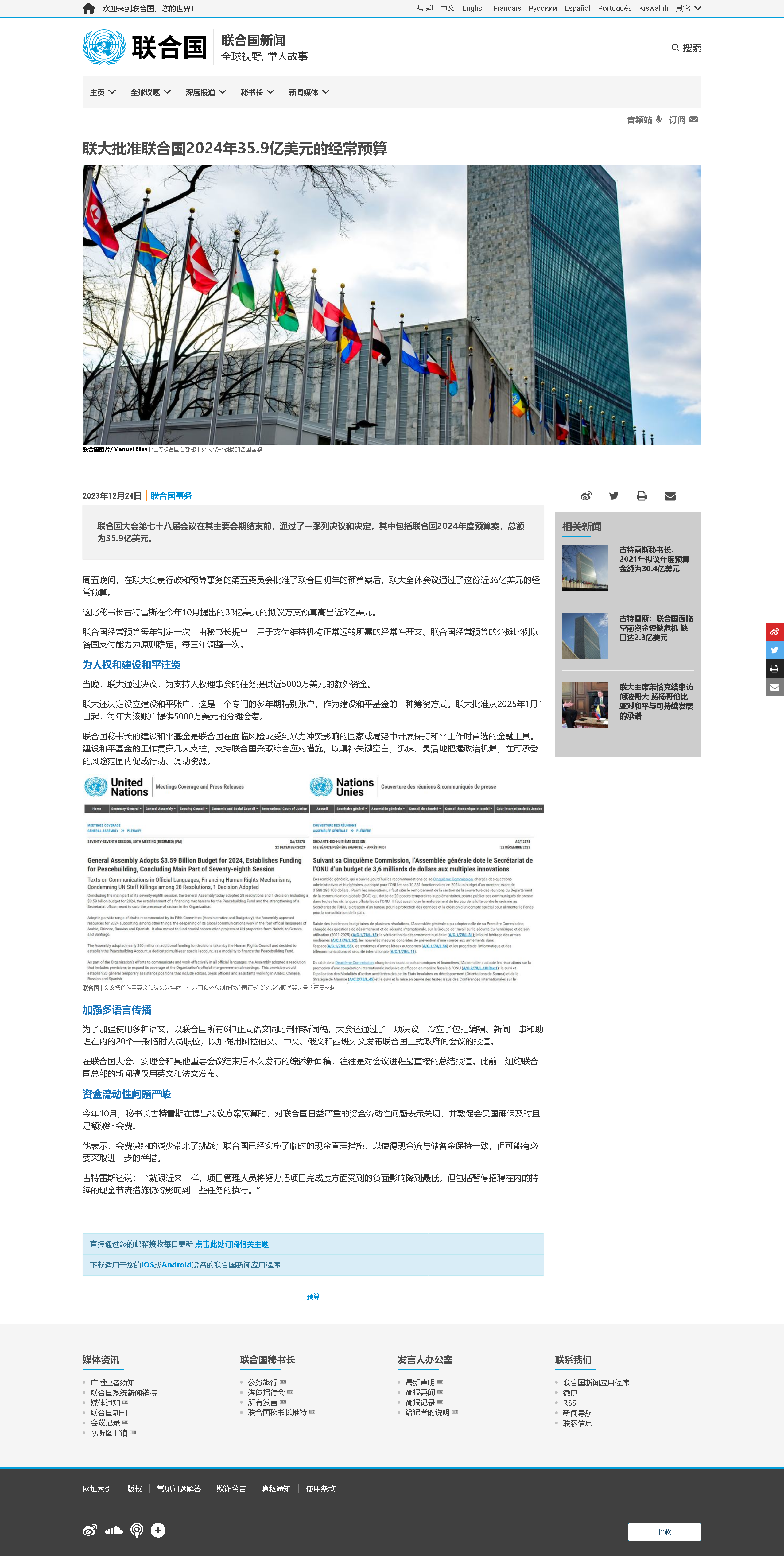 新華社聯合國12月24日電(記者尚緒謙)聯合國新聞網站24日消息,第78屆聯合國大會已批準總額約為35.9億美元的2024年度聯合國常規預算,略高于2023年度預算。