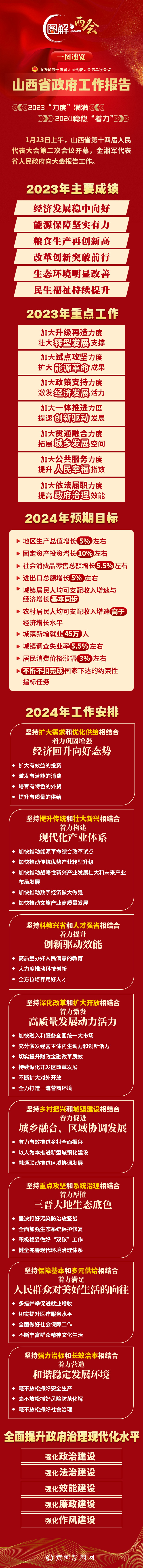 做好今年政府工作,要以習近平新時代中國特色社會主義思想為指導,全面貫徹落實黨的二十大和二十屆二中全會精神,深入學習貫徹習近平總書記對山西工作的重要講話重要指示精神,落實中央經濟工作會議精神,按照省委十二屆七次全會暨省委經濟工作會議部署,堅持穩中求進工作總基調,完整、準確、全面貫徹新發展理念,主動服務和融入新發展格局,著力推動高質量發展,全面深化改革開放,著力加強科技創新,不斷深化全方位轉型,在踐行領袖囑托、擔當重大使命上展現新作為,統籌擴大內需和深化供給側結構性改革,統籌新型城鎮化和鄉村全面振興,統籌高質量發展和高水平安全,切實增強經濟活力、防范化解風險、改善社會預期,鞏固和增強經濟回升向好態勢,持續推動經濟實現質的有效提升和量的合理增長,增進民生福祉,保持社會穩定,奮力譜寫中國式現代化山西篇章。
