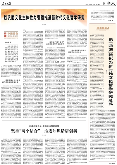 文化主體性集中體現人在文化活動中的自覺意識和自主立場。深化新時代文化哲學研究,需要以鞏固文化主體性為引領,以“兩個結合”為研究路徑和方法論指導,為建設中華民族現代文明提供哲學智慧滋養。