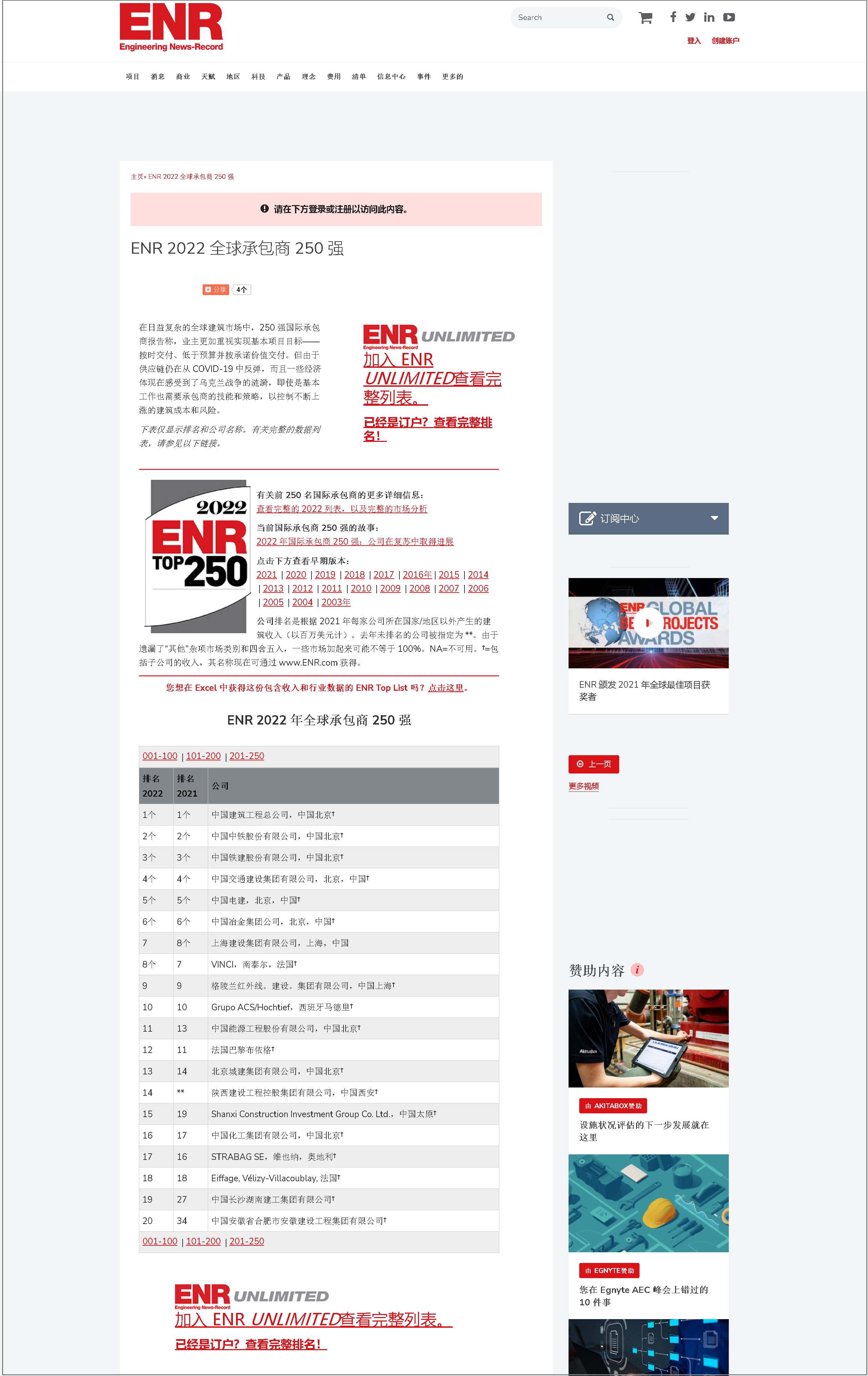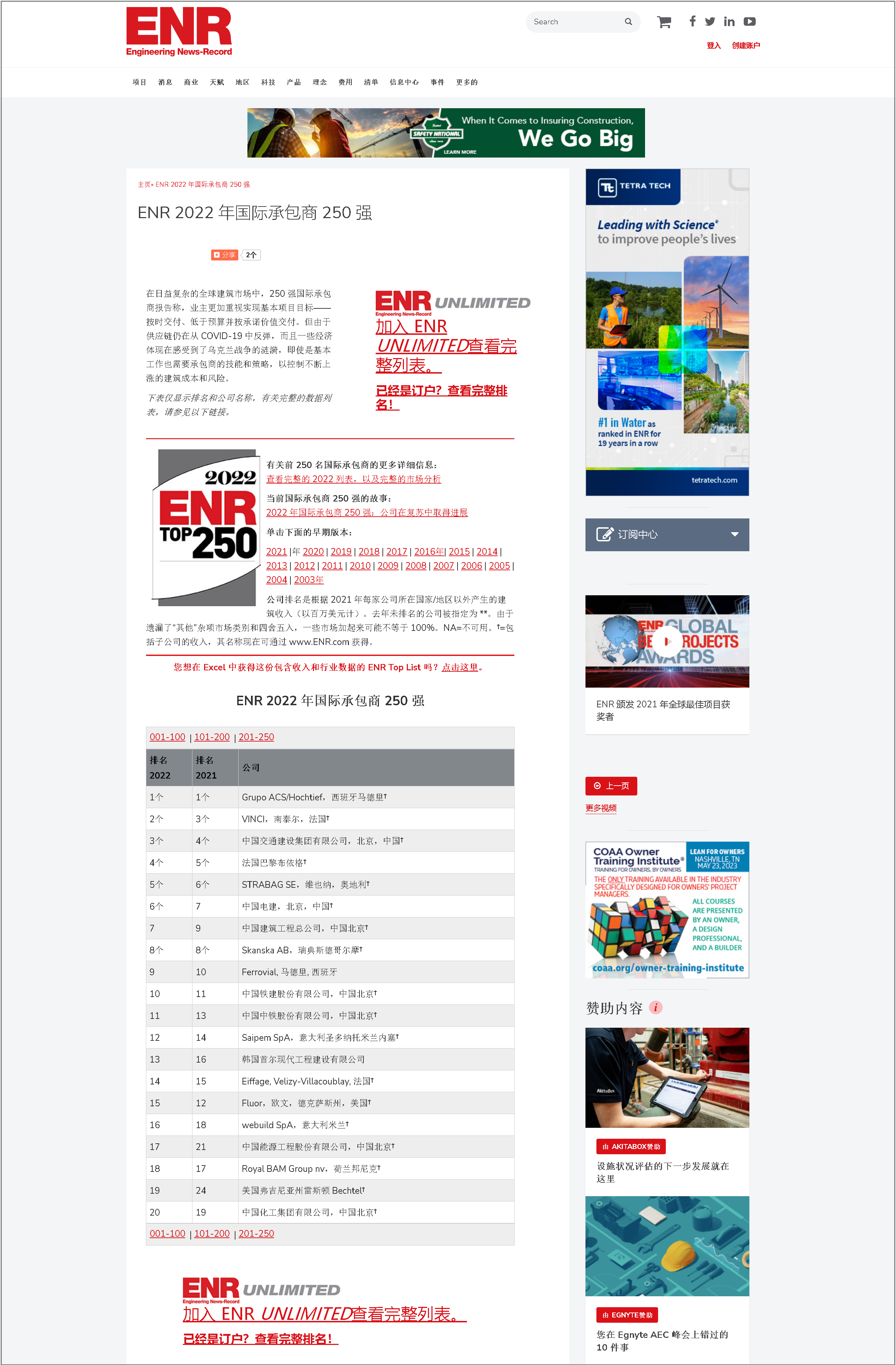 每年 8 月發布的國際承包商 250 強榜單根據總建筑承包出口收入對全球 250 家最大的公共和私營建筑承包商進行排名,這些出口收入來自每個公司各自本國以外的項目。