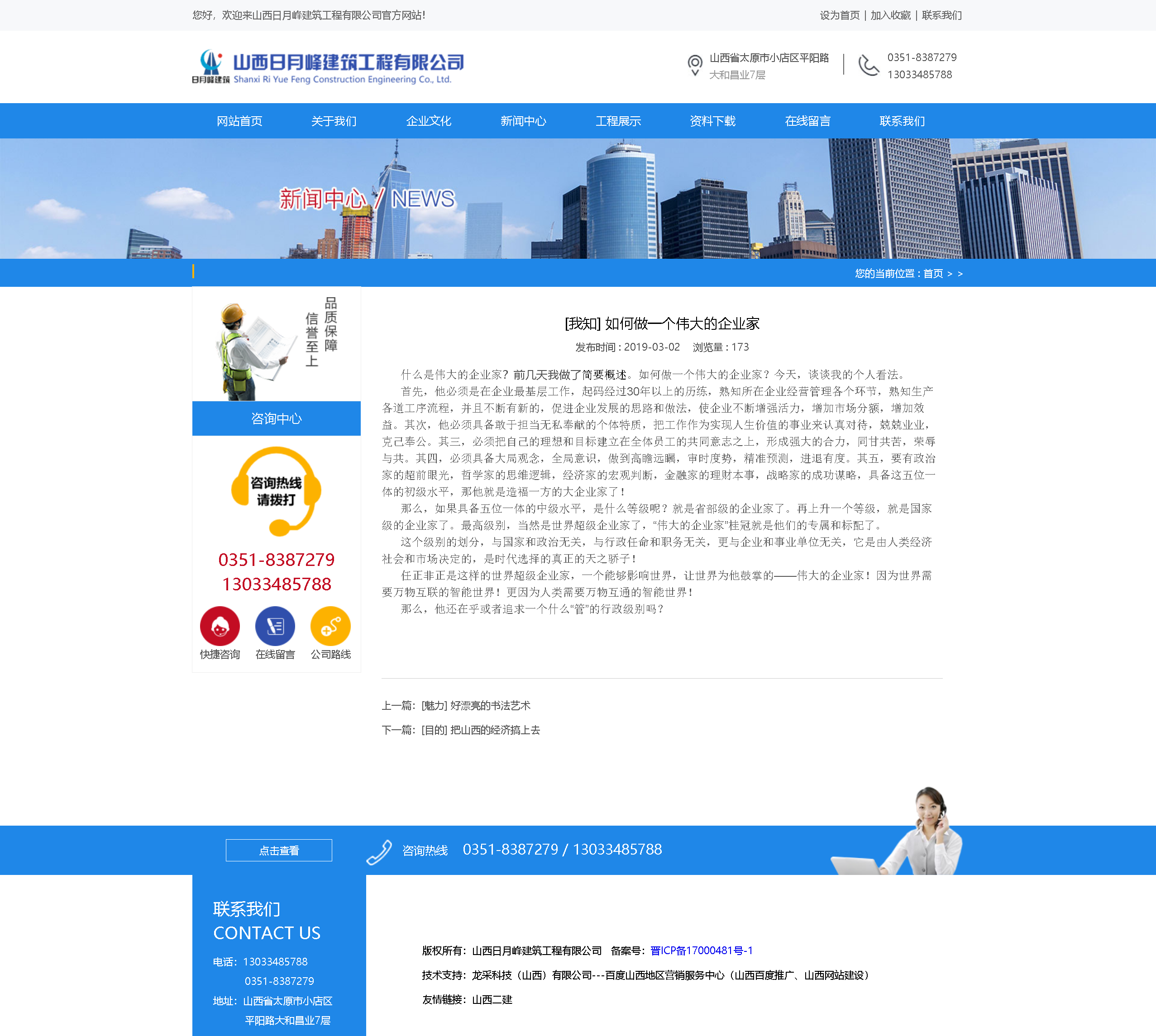 作為建筑企業,把建造人類美好幸福的家園,作為實現企業做大做強的發展戰略,需要科技領先,技術先進,理念超前,服務周到,一流的質量,一流的信譽,一流的觀念!