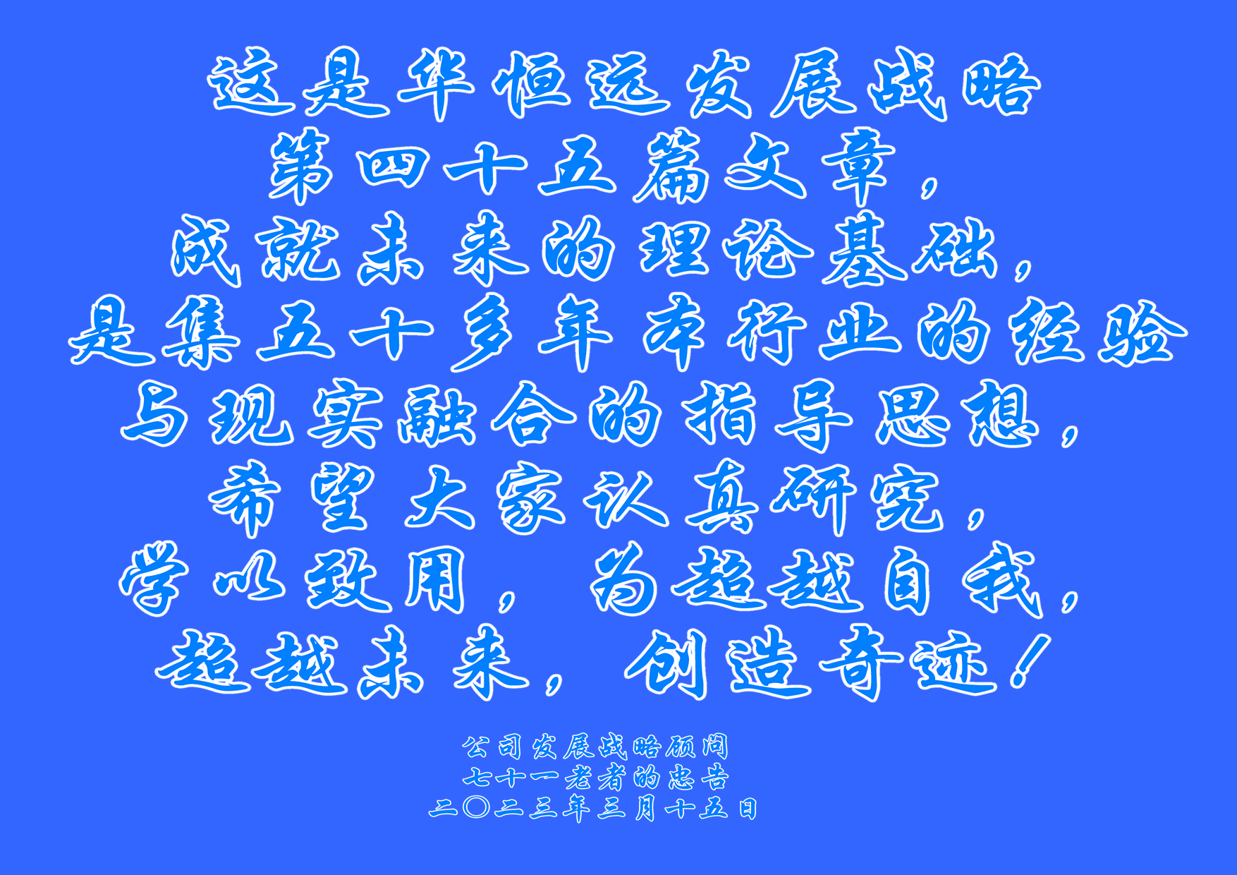 這是華恒遠發展戰略第四十五篇文章,成就未來的理論基礎,是集五十多年本行業的經驗與現實融合的指導思想,希望大家認真研究,學以致用,為超越自我,超越未來,創造奇跡!