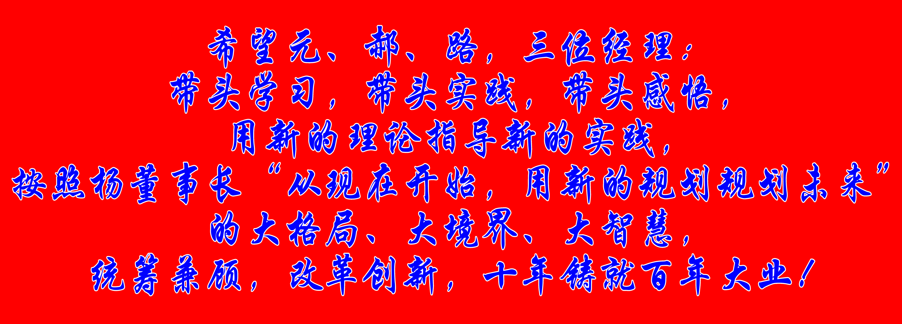 希望元、郝、路,三位經(jīng)理,帶頭學(xué)習(xí),帶頭實(shí)踐,帶頭感悟,用新的理論指導(dǎo)新的實(shí)踐,按照楊董事長“從現(xiàn)在開始,用新的規(guī)劃規(guī)劃未來”的大格局、大境界、大智慧,統(tǒng)籌兼顧,改革創(chuàng)新,十年鑄就百年大業(yè)!