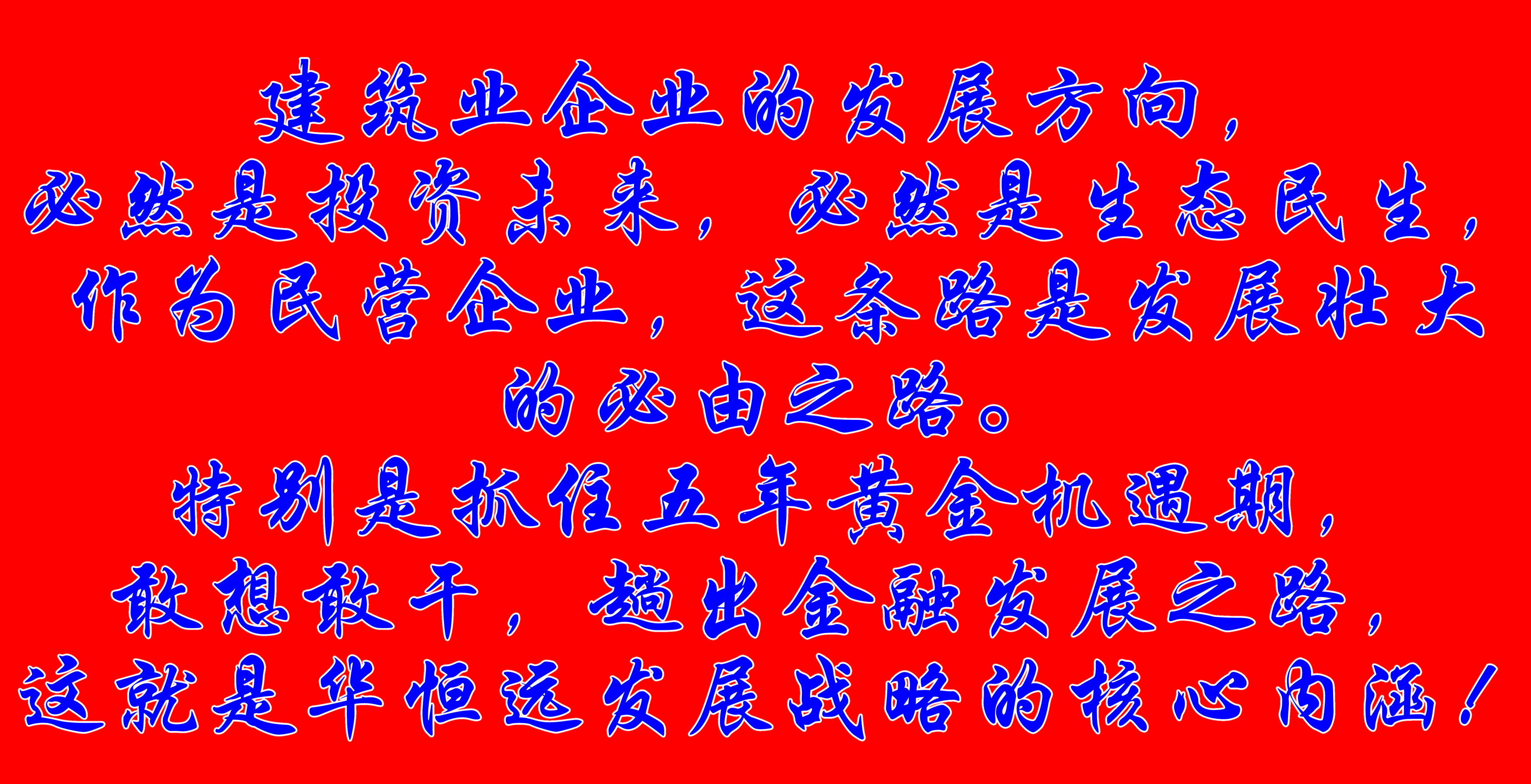建筑業(yè)企業(yè)的發(fā)展方向,必然是投資未來(lái),必然是生態(tài)民生。作為民營(yíng)企業(yè),這條路是發(fā)展壯大的必由之路。特別是抓住五年黃金機(jī)遇期,敢想敢干,趟出金融發(fā)展之路,這就是華恒遠(yuǎn)發(fā)展戰(zhàn)略的核心內(nèi)涵!