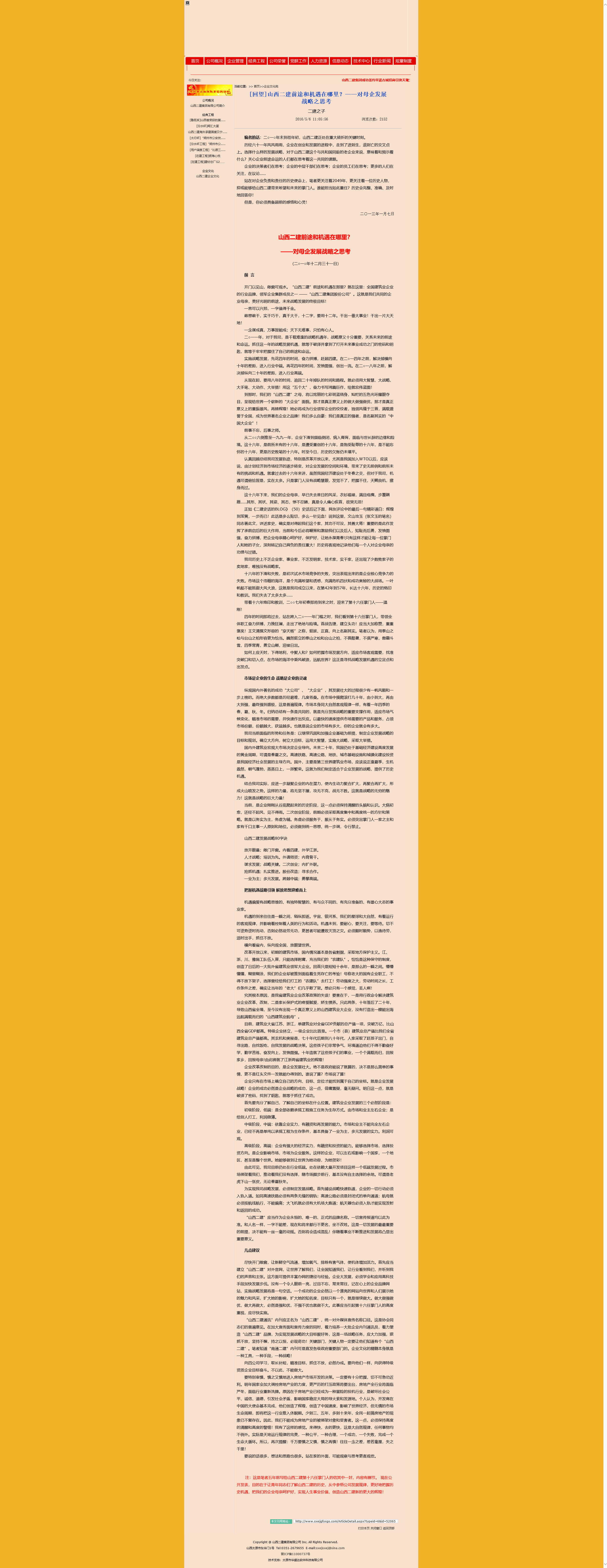 注:這是筆者五年前寫給山西二建第十六任掌門人的信其中一封,內容有刪節。 現在公開發表,目的在于讓青年同志們了解山西二建的歷史,從中參悟公司發展規律,更好地把握歷史機遇,把我們的企業母親呵護好,實現人生事業價值,創造山西二建新的更大的輝煌!