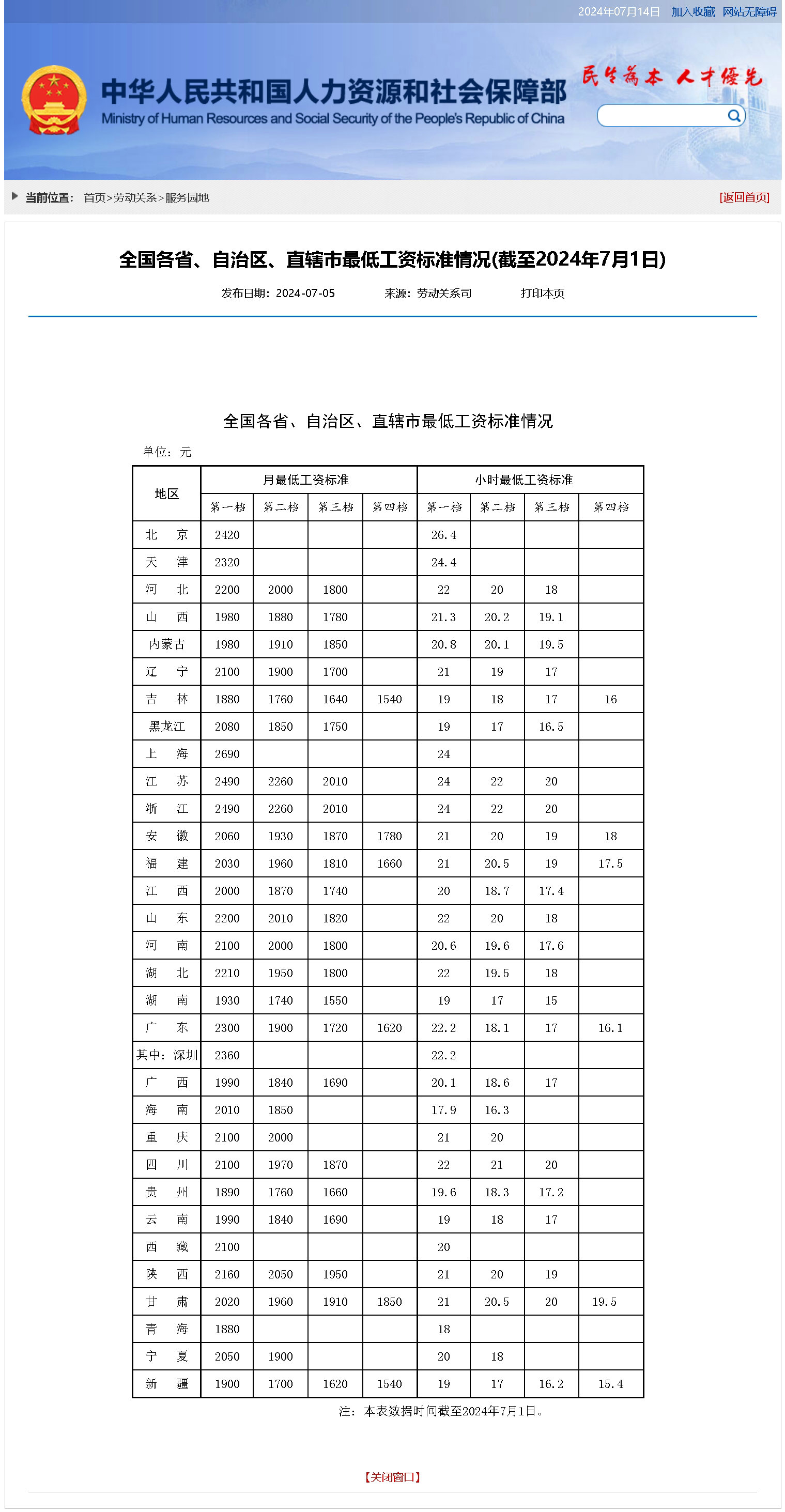 全國各省、自治區(qū)、直轄市最低工資標(biāo)準(zhǔn)情況(截至2024年7月1日)