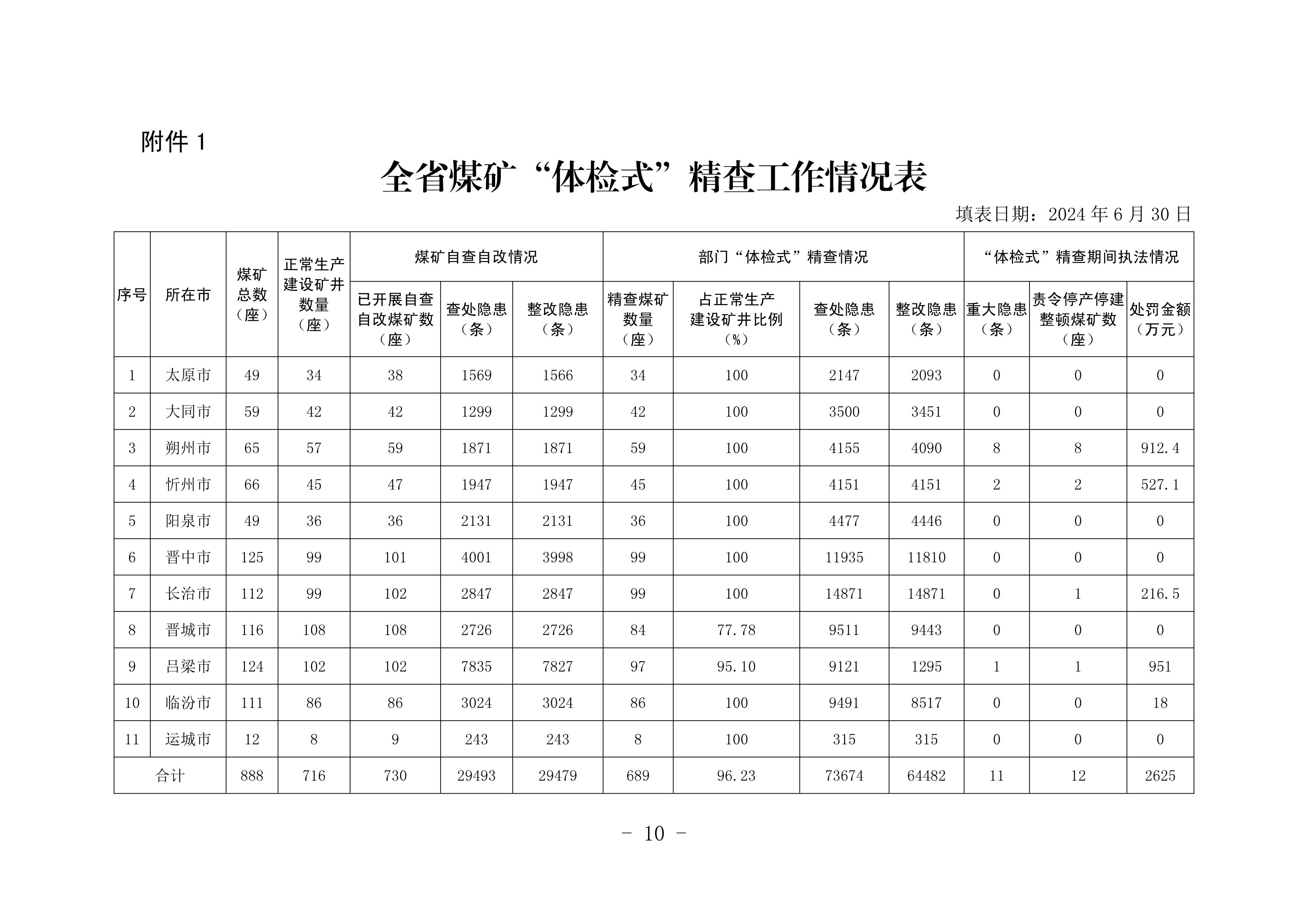 煤礦方面,到 2024 年 6 月底,各市共對689 座正常生產建設煤礦進行了“體檢式”精查,完成率96.23%。共查處問題隱患 73674 條,已整改 64482 條,整改率87.52%。各市“體檢式”精查完成情況為:太原市 100%、大同市100%、朔州市100%、忻州市 100%、陽泉市 100%、晉中市100%、長治市100%、臨汾市100%、運城市 100%、呂梁市 95.1%、晉城市77.78%。