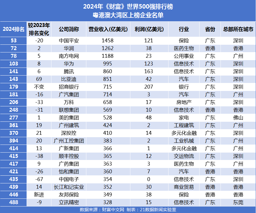 據(jù)21數(shù)據(jù)新聞實(shí)驗(yàn)室統(tǒng)計(jì),粵港澳大灣區(qū)共有22家公司入圍世界500強(qiáng),2023年?duì)I收總額約為1.39萬億美元,利潤總額為919億美元。