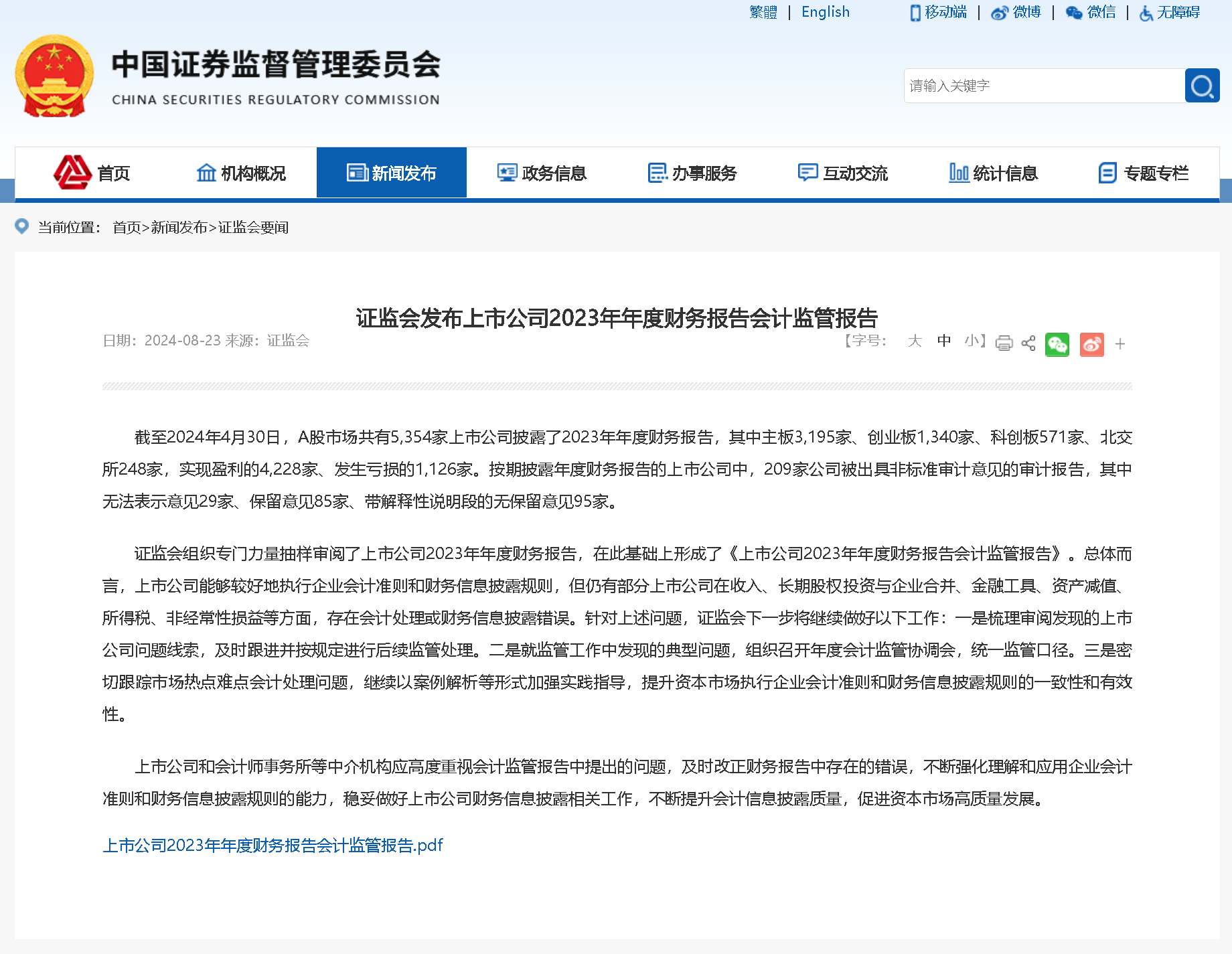 證監(jiān)會(huì)發(fā)布上市公司2023年年度財(cái)務(wù)報(bào)告會(huì)計(jì)監(jiān)管報(bào)告