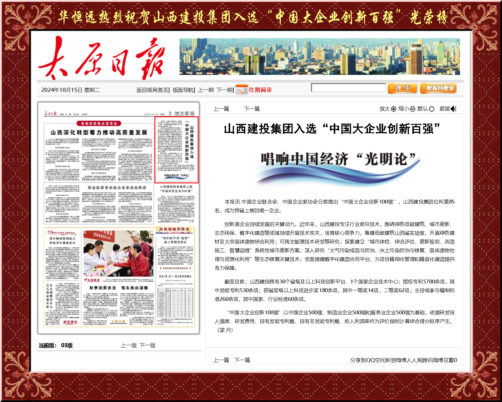 中國企業聯合會、中國企業家協會日前推出“中國大企業創新100強”,山西建投集團位列第85名,成為我省上榜的唯一企業。