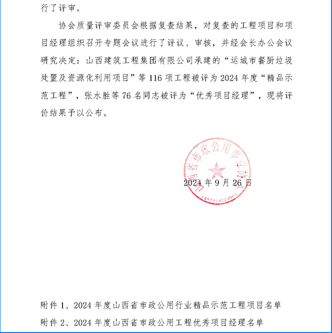 近日,山西省市政公用事業協會公布2024年度山西省市政公用行業精品示范工程榮譽和山西省市政公用行業工程最高質量、優秀項目經理的評價結果。總承包公司承建的祥和路改造工程EPC工程項目榮獲“精品示范工程獎”,職工武舉國榮獲“優秀項目經理”榮譽稱號。