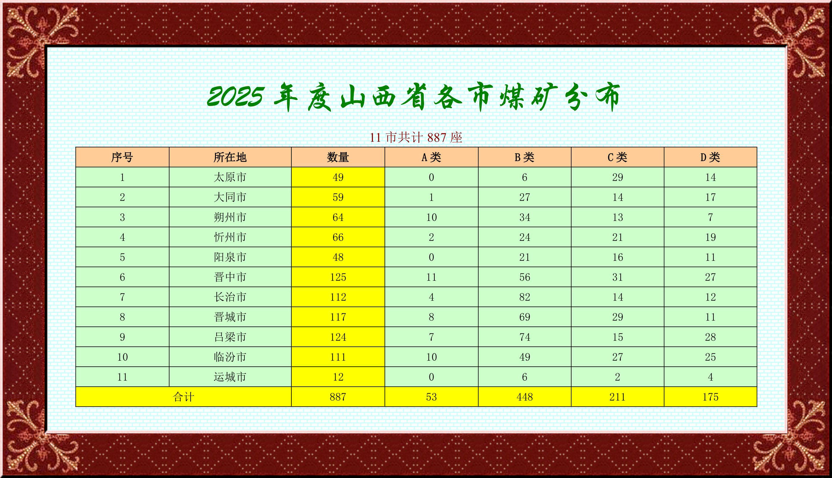為進(jìn)一步推動(dòng)全省煤礦分類工作,按照省政府辦公廳《關(guān)于印發(fā)山西省煤礦分級(jí)分類安全監(jiān)管監(jiān)察辦法的通知》(晉政辦發(fā)〔2020〕22 號(hào))要求,省應(yīng)急廳對(duì)各市上報(bào)的 2025 年煤礦分類情況組織開(kāi)展了審核、公示工作,其中 A 類煤礦 53 座、B 類煤礦 448 座、C 類煤礦 211 座、D 類煤礦 175 座。