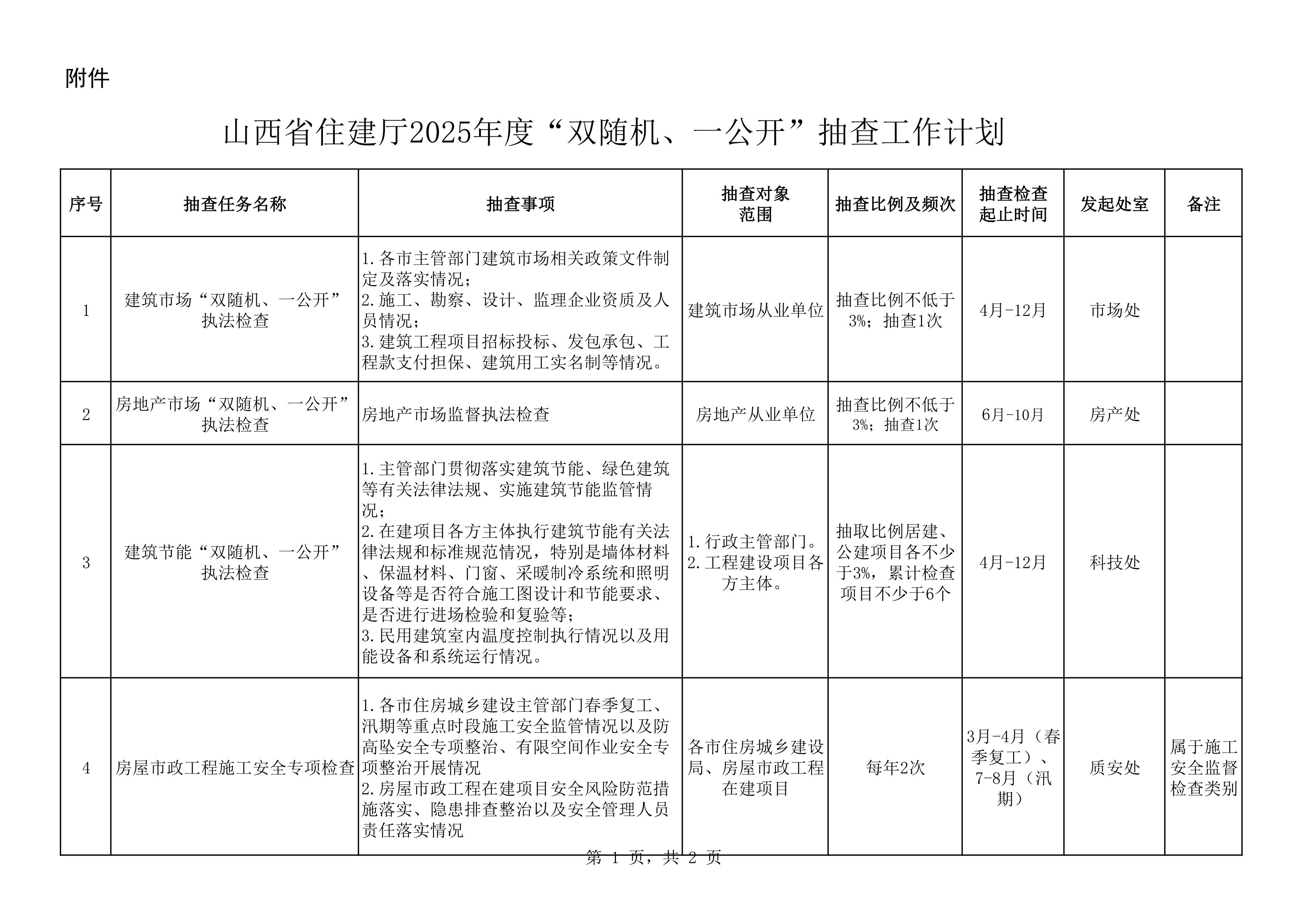 為進一步貫徹落實國家及我省關于“雙隨機、一公開”監管工作的決策部署,切實做好我省住建領域“雙隨機、一公開”監管工作,按照《山西省人民政府辦公廳關于印發〈山西省嚴格規范涉企行政檢查的若干措施〉的通知》(晉政辦發〔2025〕9號)、《山西省住房和城鄉建設廳關于印發〈“雙隨機、一公開”抽查工作細則〉的通知》(晉建市規字〔2022〕160號)要求,經商有關處室,制定了《山西省住建廳2025年度“雙隨機、一公開”抽查工作計劃》,現印發給你們,并就有關事項通知如下: