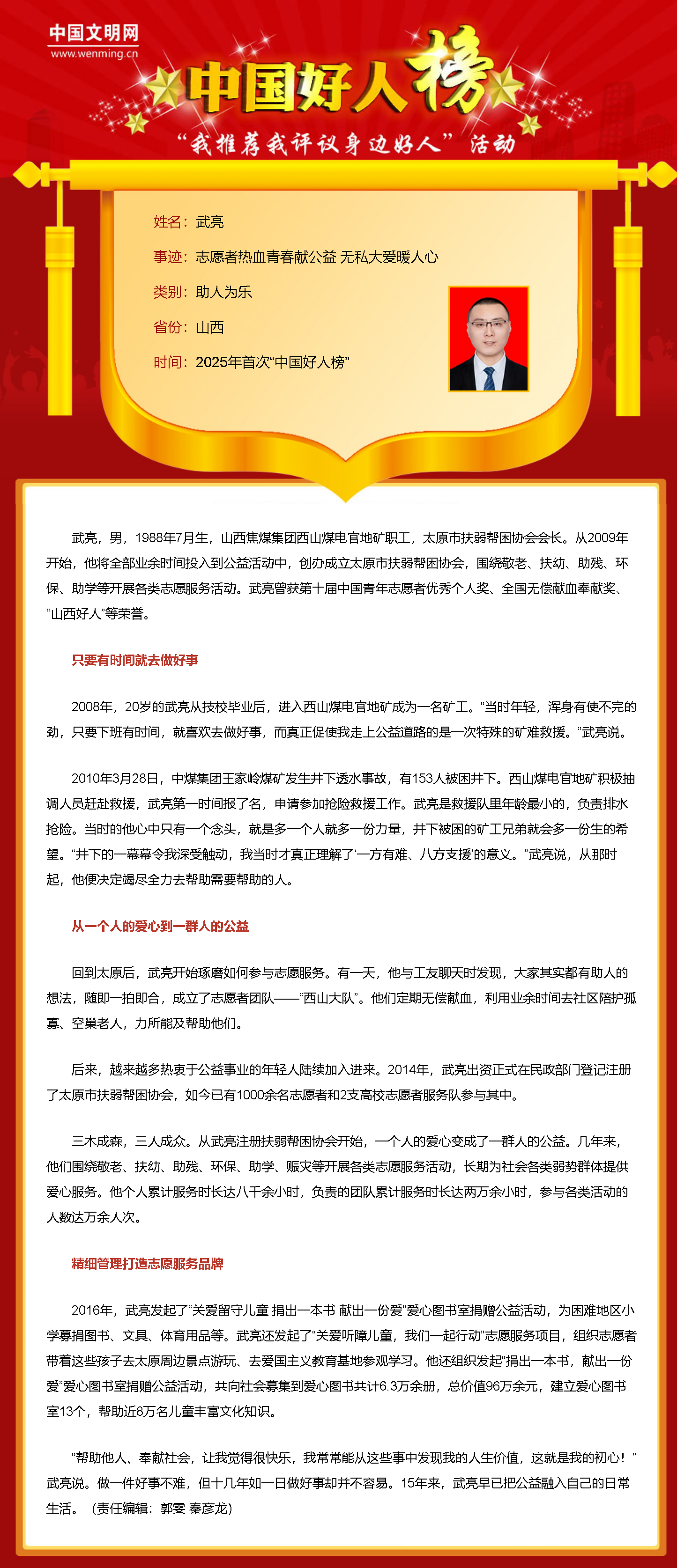 今年37歲的武亮,是山西焦煤集團西山煤電官地礦的一名普通職工,更是太原市扶弱幫困協會的領路人。自2009年起,他將滿腔熱忱與所有業余時光,毫無保留地傾注于公益事業,躬身力行在敬老、扶幼、助殘、環保、助學等多個領域,持續奔走在志愿服務的道路上。16年來,他負責的團隊累計服務時長達兩萬余小時,并通過一次次志愿服務,向需要幫助的人傳遞希望與力量,以點滴善行照亮他人前行路。