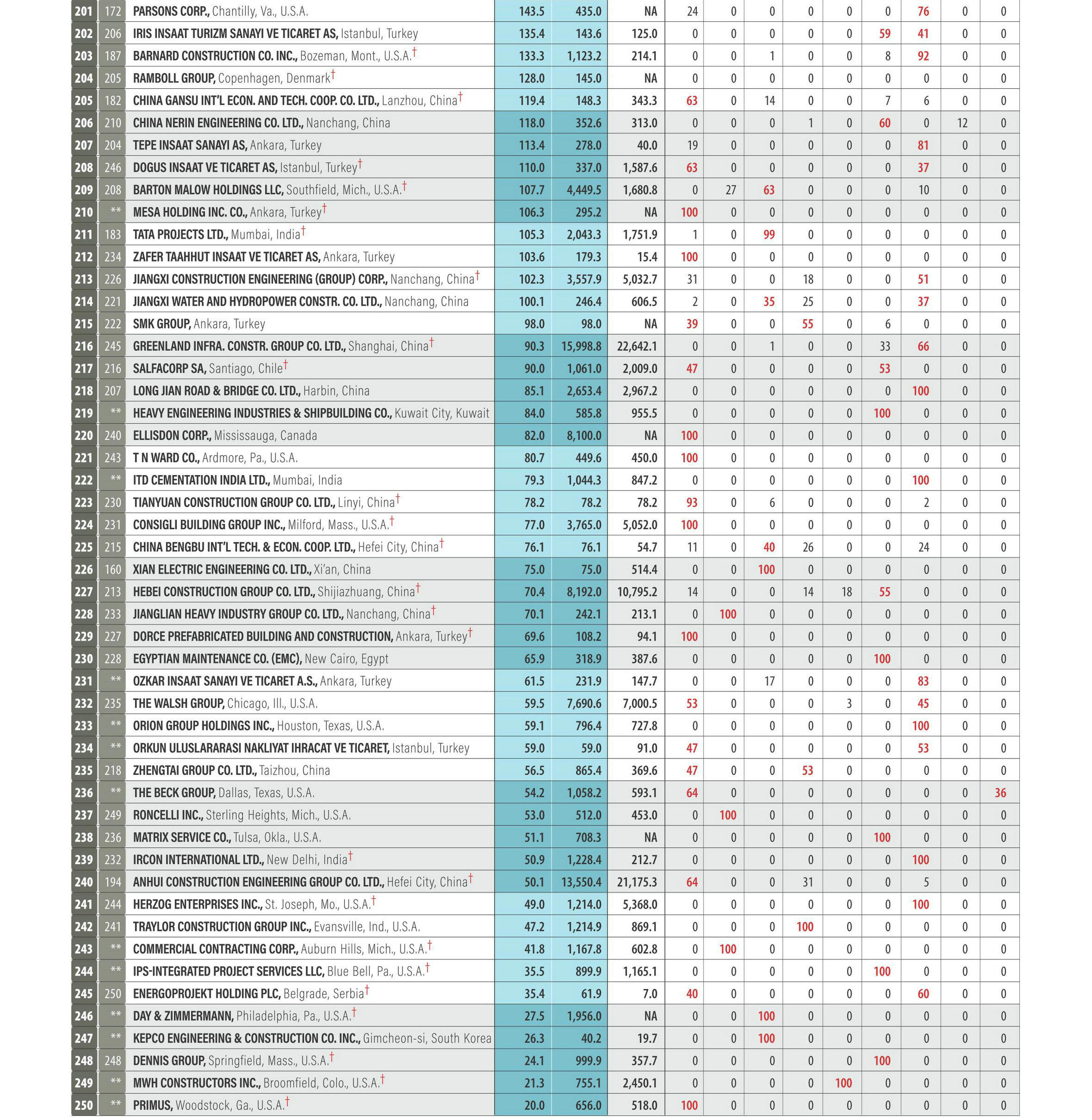 在ENR同期發布的“最大250家全球承包商”榜單中(以國內與國際營業額合計排序),共7家中國企業進入前10強,與上年度持平,其中中國建筑、中國中鐵、中國鐵建、中國交建包攬前4位,中國電建排名第6位、中冶科工排名第7位、上海建工排名第8位。此外,中國能建、北京城建、山西建投、中國化學工程、陜西建工、湖南建投、北京建工、綠地大基建、中國核建、安徽建工、特變電工、中油工程、山東高速、浙江建投、四川路橋、東方電氣、上海城建等企業進入榜單前50強,體現了中國企業在全球基建行業的重要地位。