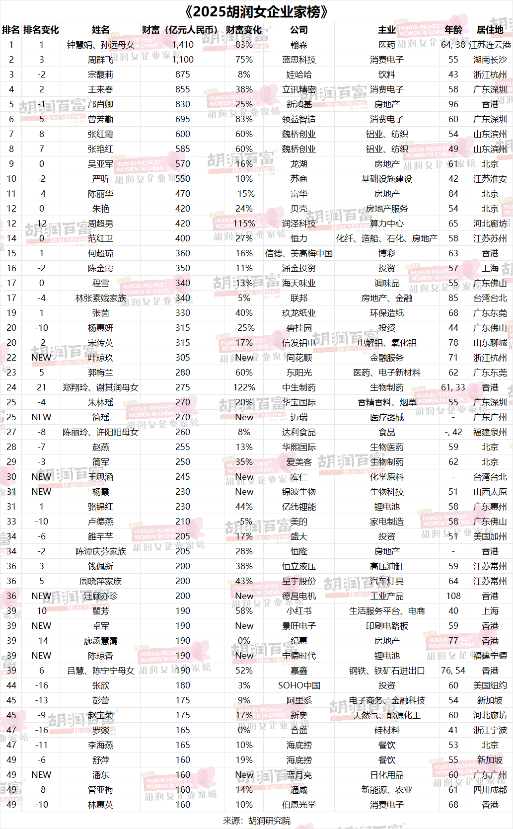 胡潤研究院發(fā)布《2025胡潤女企業(yè)家榜》