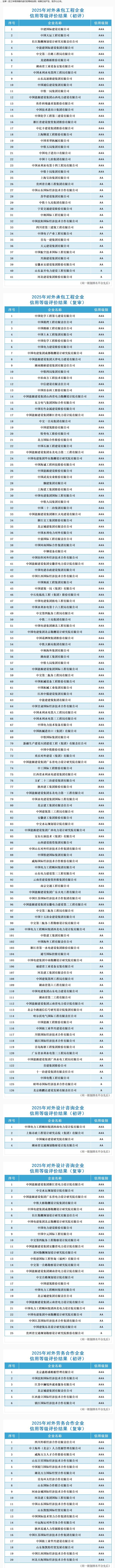 11月13日,2025年中國對外承包工程商會企業信用等級評價結果公布,山西建投通過對外承包工程AAA級信用企業復審(在三年有效期內進行的等級復核),連續八年被評為最高信用等級AAA級企業。