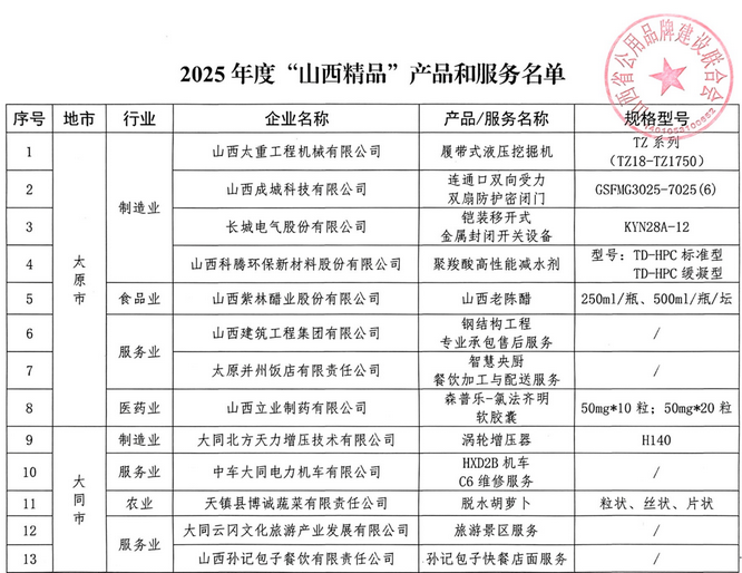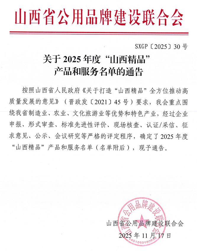 【行業動態】關于2025年度“山西精品” 產品和服務名單的通告