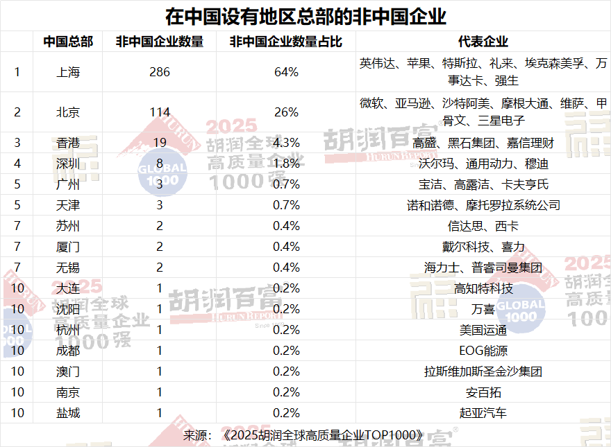 在上榜的非中國企業中,半數以上(已知446家)在中國設有地區總部,其中64%在上海,26%在北京。