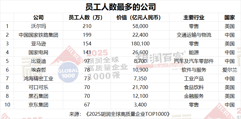 沃爾瑪仍然是員工人數最多的上榜企業,擁有210萬名員工。緊隨其后的是中國國家鐵路集團,憑借其覆蓋全國的龐大運輸網絡,雇用了199萬名員工。亞馬遜排名第三,擁有154萬名員工,反映了其龐大的全球履行和物流業務。