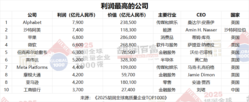 Alphabet的利潤最高,達7900億元人民幣,其次是沙特阿美(7400億元人民幣)和蘋果(6800億元人民幣)