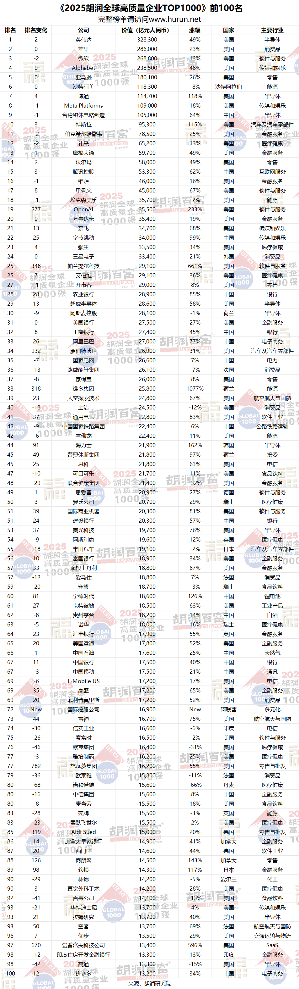 《2025胡潤全球高質量企業TOP1000》前100名