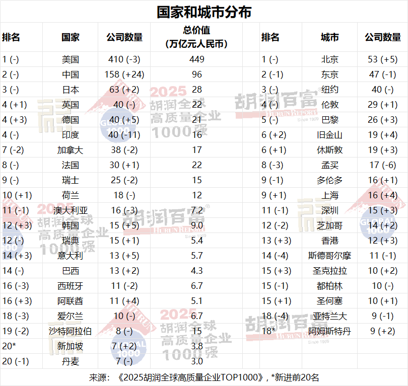 美國繼續在胡潤全球1000強中以410家公司領先,但減少了3家,中國增加了24家公司,以158家公司位居第二,其中,國有企業83家,非國有企業75家。美國和中國占胡潤全球1000強的55%。