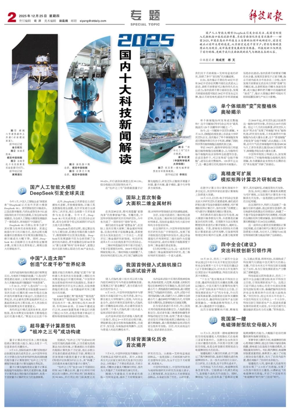 入選的2025年國內十大科技新聞分別是:國產人工智能大模型DeepSeek引發全球關注;中國“人造太陽”創造“億度千秒”世界紀錄;超導量子計算原型機“祖沖之三號”成功構建;國際上首次制備大面積二維金屬材料;我國首例侵入式腦機接口臨床試驗開展;月球背面演化歷史首次揭開;單個體細胞“變”完整植株奧秘揭示;高精度可擴展模擬矩陣計算芯片研制成功;四中全會《建議》突出科技創新引領作用;我國第一艘電磁彈射型航空母艦入列。