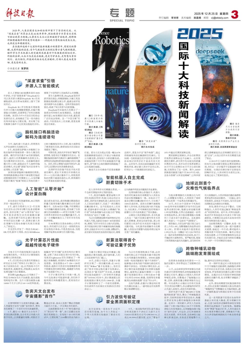 入選的2025年國際十大科技新聞分別是:“深度求索”引領開源人工智能模式;腦機接口將腦活動解碼為連續語句;人工智能“從零開始”設計蛋白酶;光子計算芯片性能超越傳統電子硬件;魯賓天文臺發布宇宙攝影“首作”;智能機器人自主完成膽囊切除手術;新算法取得首個可驗證量子優勢;引力波信號驗證霍金黑洞面積定理;地球達到首個災難性氣候臨界點;跨物種哺乳動物腦細胞發育圖繪成。