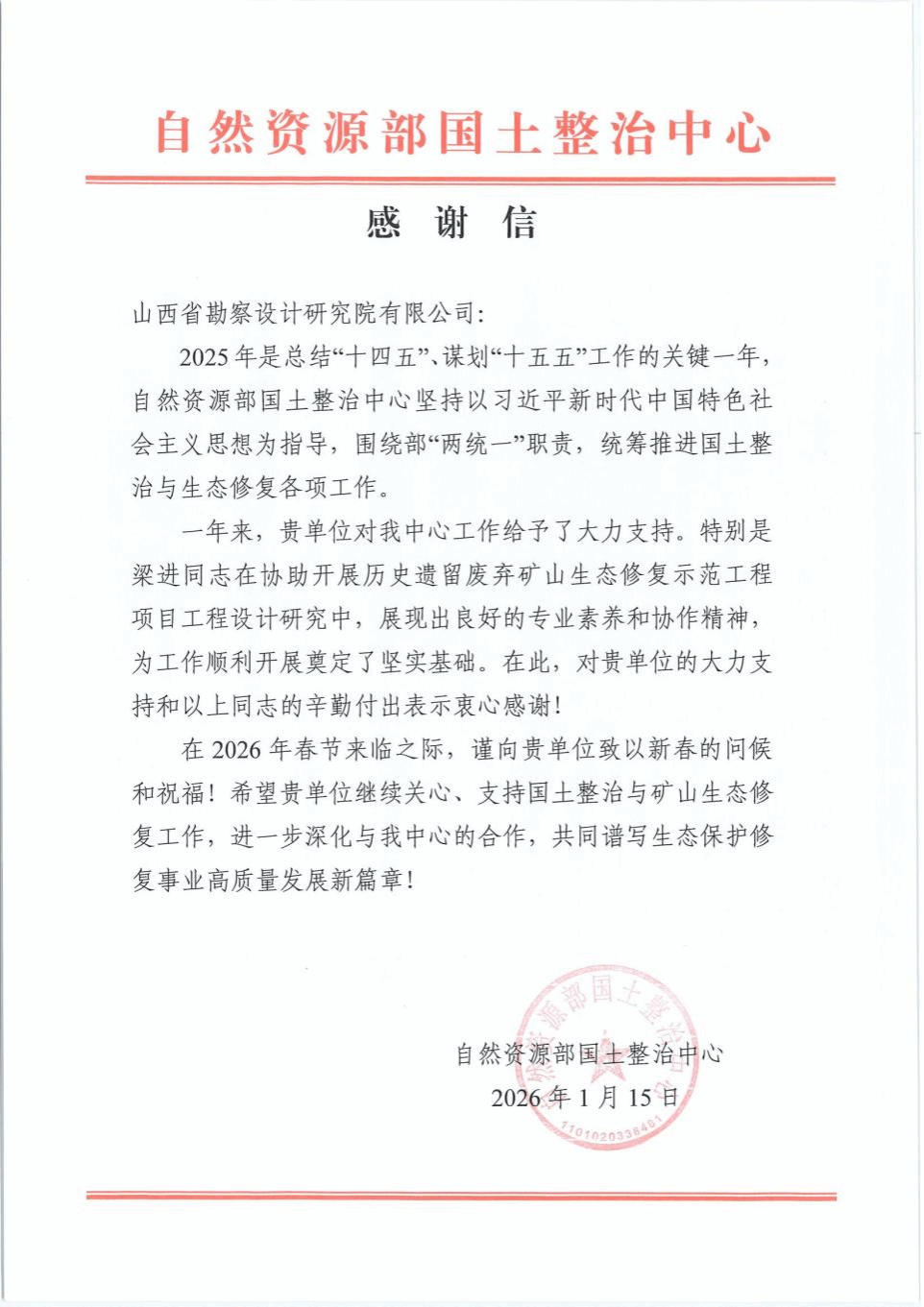 近日,山西建投勘察院公司收到來(lái)自自然資源部國(guó)土整治中心發(fā)來(lái)的感謝信,信中對(duì)公司在國(guó)土整治與生態(tài)修復(fù)工作中的大力支持致以誠(chéng)摯謝意。