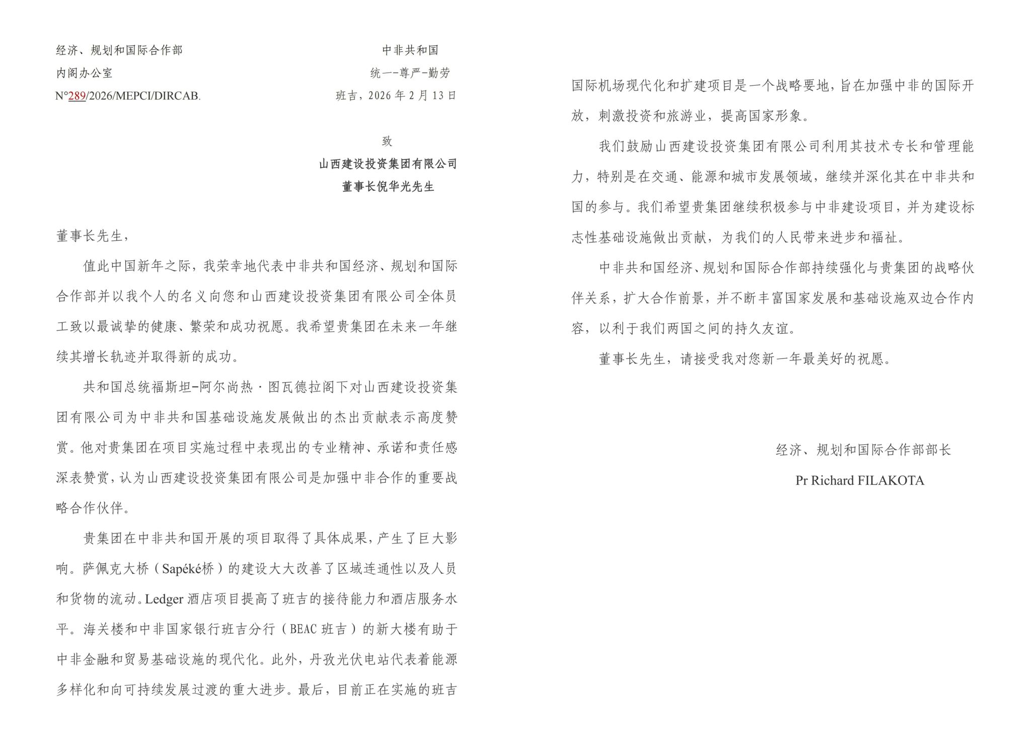 近日,山西建投收到中非共和國經濟、規劃和國際合作部表揚信,信中對集團在項目實施過程中表現出的專業精神、承諾和責任感表示贊賞,并對集團為中非共和國基礎設施發展作出的貢獻給予充分肯定。此次獲得中非共和國表揚,展現了集團在海外項目中的履約能力,為深化雙方后續合作奠定了良好基礎。