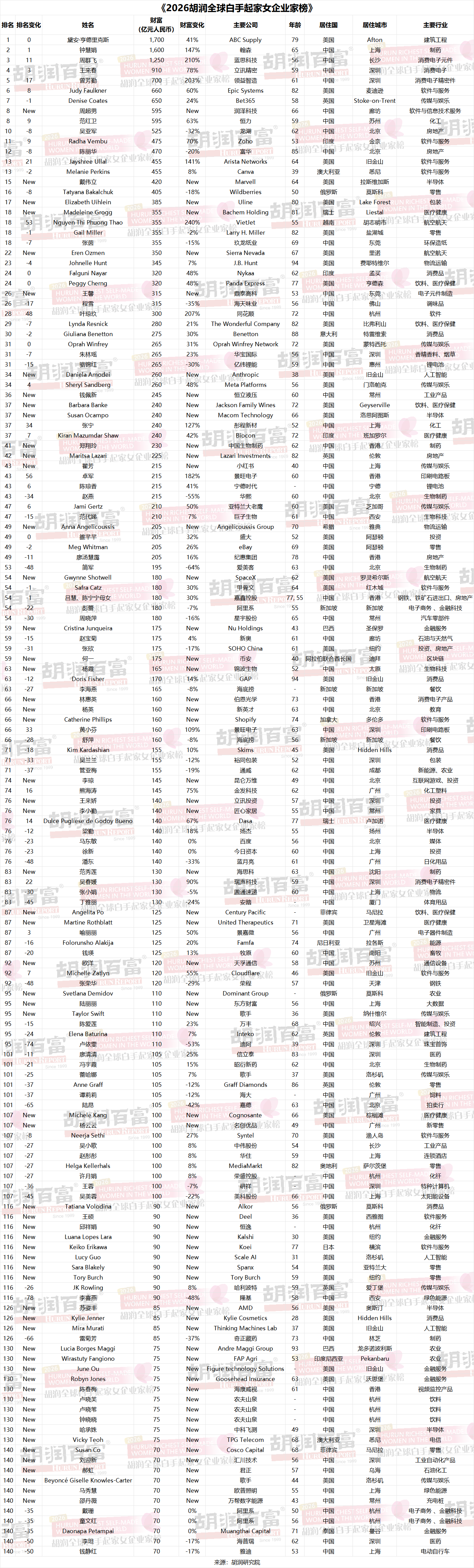 翰森駐上海的鐘慧娟是榜單中財富增長最多的企業家,財富在三年內翻倍至1600億元人民幣,蟬聯亞洲白手起家女首富,同時位居全球第二;“觸屏女王”長沙藍思科技的周群飛排名第三,財富增長兩倍,達到1250億元人民幣